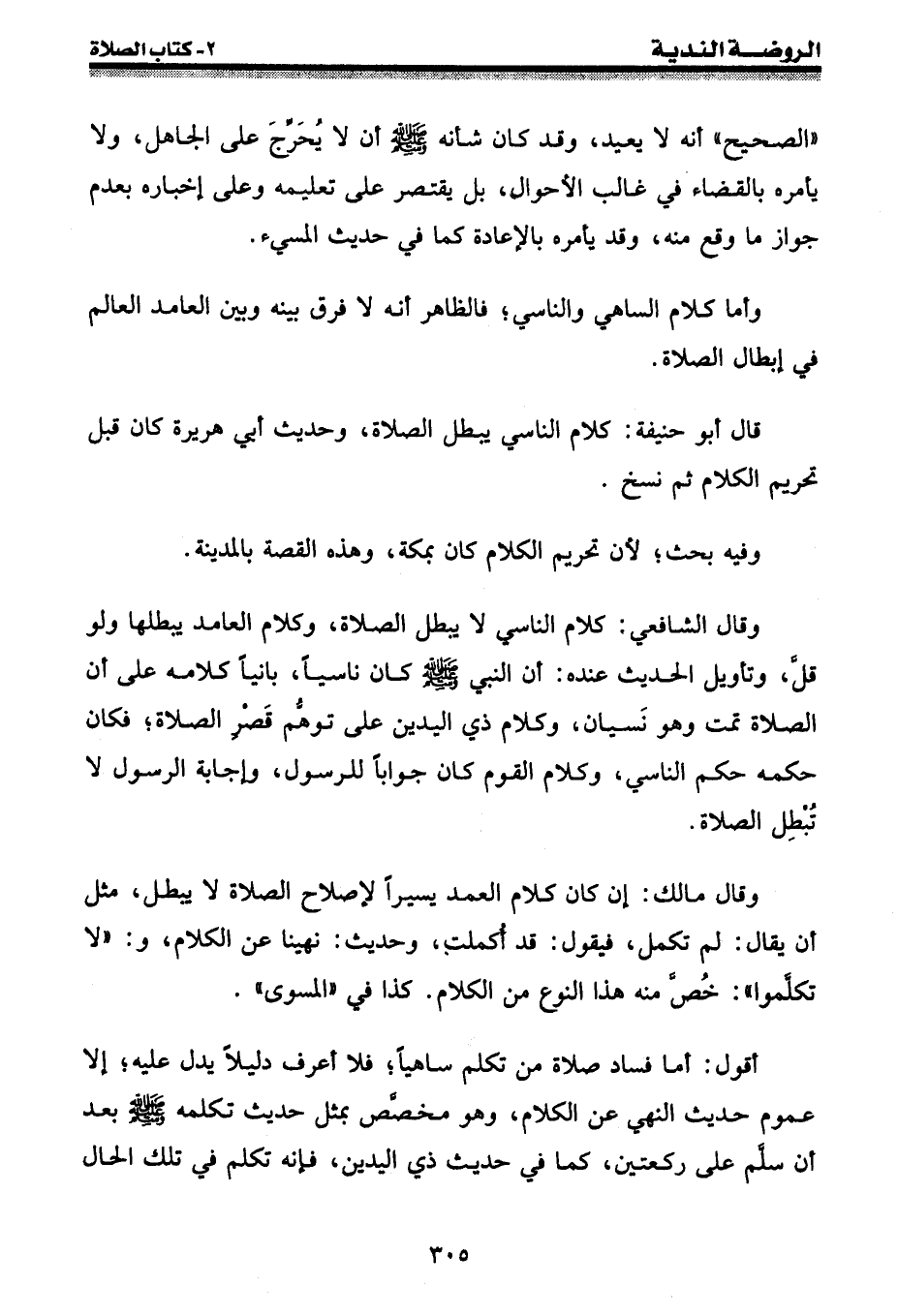 وقال الشافعي: كلام الناسي لا يبطل الصلاة، وكلام العامد يبطلها ولو قل، وتأويل الحديث عنده: أن النبي [صلى الله عليه وسلم] كان ناسيا، بانيا كلامه على أن الصلاة تمت وهو نسيان، وكلام ذي اليدين على توهم قصر الصلاة؛ فكان حكمه حكم الناسي، وكلام القوم كان جوابا للرسول، وإجابة الرسول لا تبطل الصلاة.