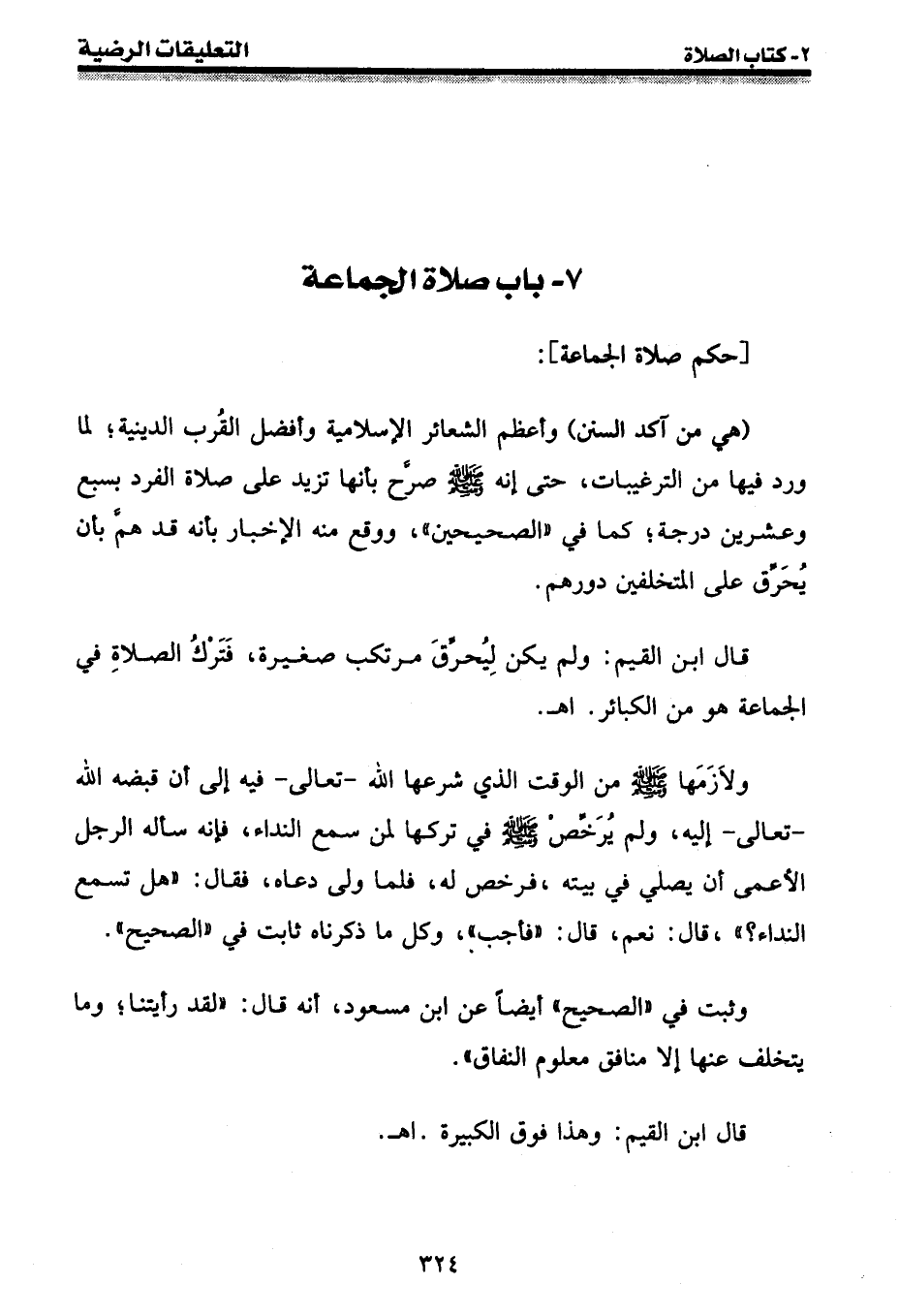 (هي من آكد السنن) وأعظم الشعائر الإسلامية وأفضل القرب الدينية؛ لما ورد فيها من الترغيبات، حتى إنه [صلى الله عليه وسلم] صرح بأنها تزيد على صلاة الفرد بسبع وعشرين درجة؛ كما في " الصحيحين "، ووقع منه الإخبار بأنه قد هم بأن يحرق على المتخلفين دورهم.