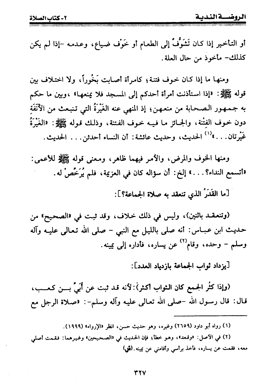 ومنها الخوف والمرض، والأمر فيهما ظاهر، ومعنى قوله [صلى الله عليه وسلم] للأعمى: " أتسمع النداء؟ ... " الخ: أن سؤاله كان في العزيمة، فلم يرخص له.