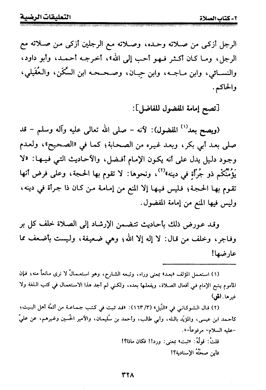 (ويصح بعد (¬1) المفضول) : لأنه -[صلى الله عليه وسلم]- قد صلى بعد أبي بكر، وبعد غيره من الصحابة؛ كما في " الصحيح "، ولعدم وجود دليل يدل على أنه يكون الإمام أفضل، والأحاديث التي فيها: " لا يؤمنكم ذو جرأة في دينه " (¬2) ، ونحوها: لا تقوم بها الحجة، وعلى فرض أنها تقوم بها الحجة؛ فليس فيها إلا المنع من إمامة من كان ذا جرأة في دينه، وليس فيها المنع من إمامة المفضول.
