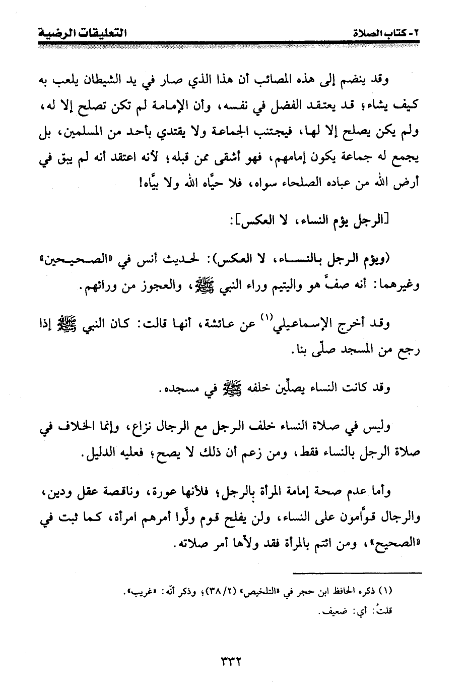 وأما عدم صحة إمامة المرأة بالرجل؛ فلأنها عورة، وناقصة عقل ودين، والرجال قوامون على النساء، ولن يفلح قوم ولوا أمرهم امرأة، كما ثبت في " الصحيح "، ومن ائتم بالمرأة فقد ولاها أمر صلاته.