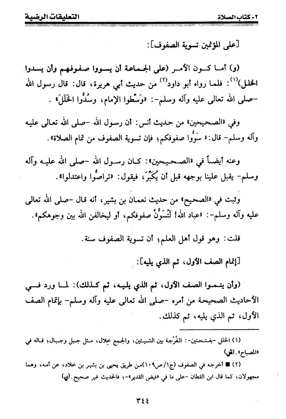 وفي " الصحيحين " من حديث أنس: أن رسول الله -[صلى الله عليه وسلم]- قال: " سووا صفوفكم؛ فإن تسوية الصفوف من تمام الصلاة ".