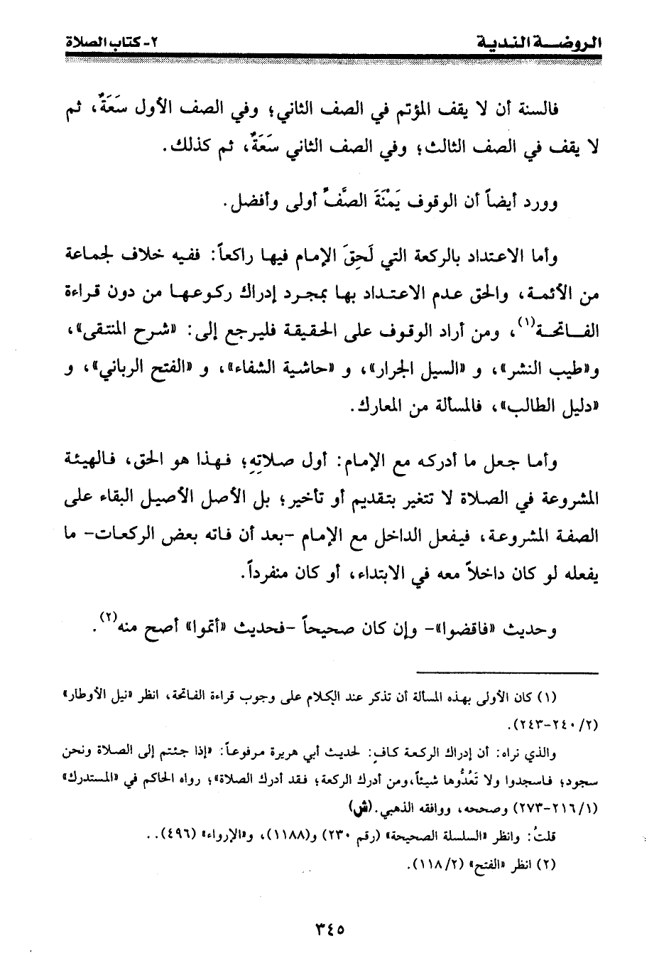 وأما الاعتداد بالركعة التي لحق الإمام فيها راكعا: ففيه خلاف لجماعة من الأئمة، والحق عدم الاعتداد بها بمجرد إدراك ركوعها من دون قراءة الفاتحة (¬1) ، ومن أراد الوقوف على الحقيقة فليرجع إلى: " شرح المنتقى "، و " طيب النشر "، و " السيل الجرار " و " حاشية الشفاء "، و " الفتح الرباني "، و " دليل الطالب "، فالمسألة من المعارك.