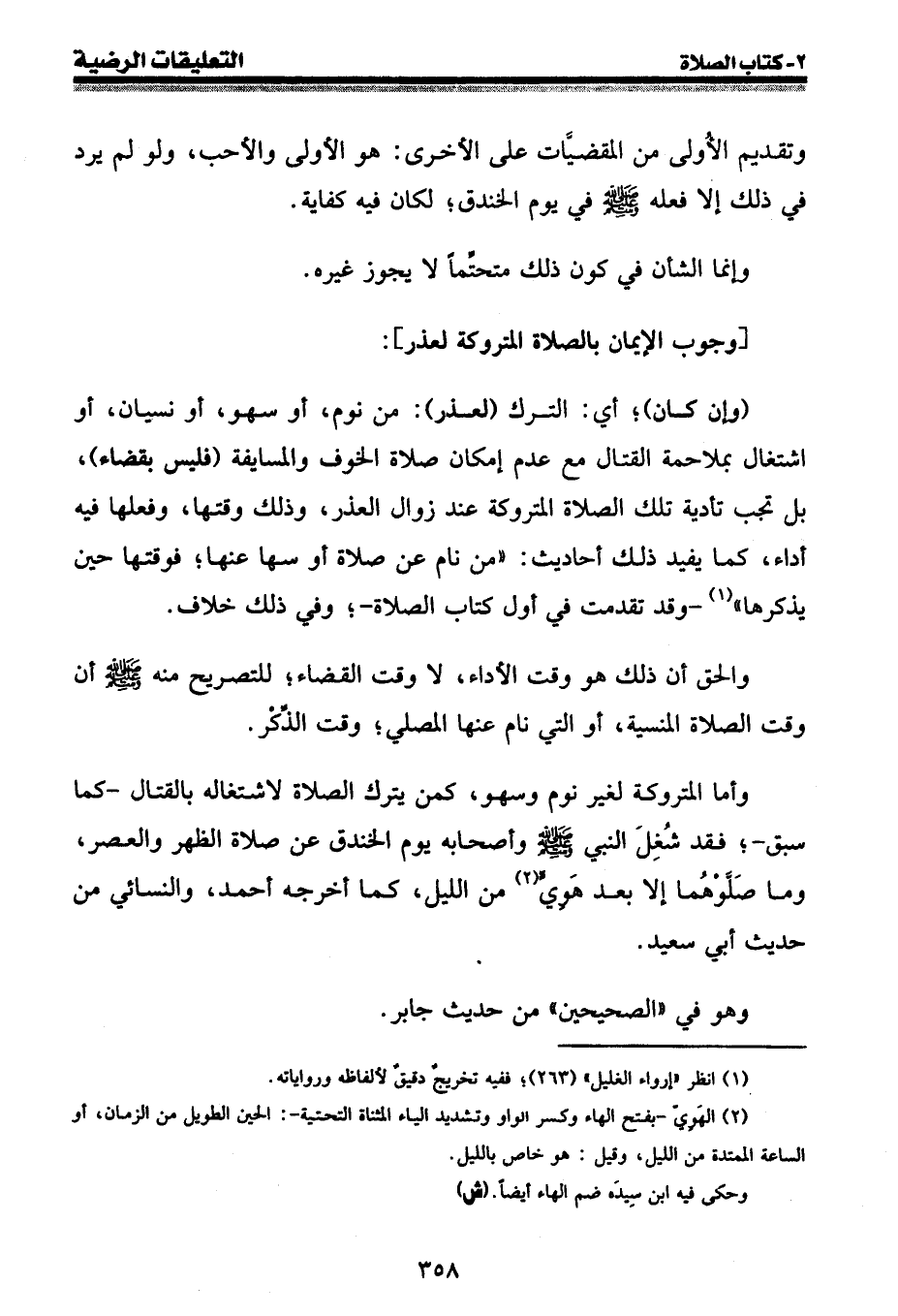 وأما المتروكة لغير نوم وسهو، كمن يترك الصلاة لاشتغاله بالقتال - كما سبق -؛ فقد شغل النبي [صلى الله عليه وسلم] وأصحابه يوم الخندق عن صلاة الظهر والعصر، وما صلوهما إلا بعد هوي (¬2) من الليل، كما أخرجه أحمد، والنسائي من حديث أبي سعيد.