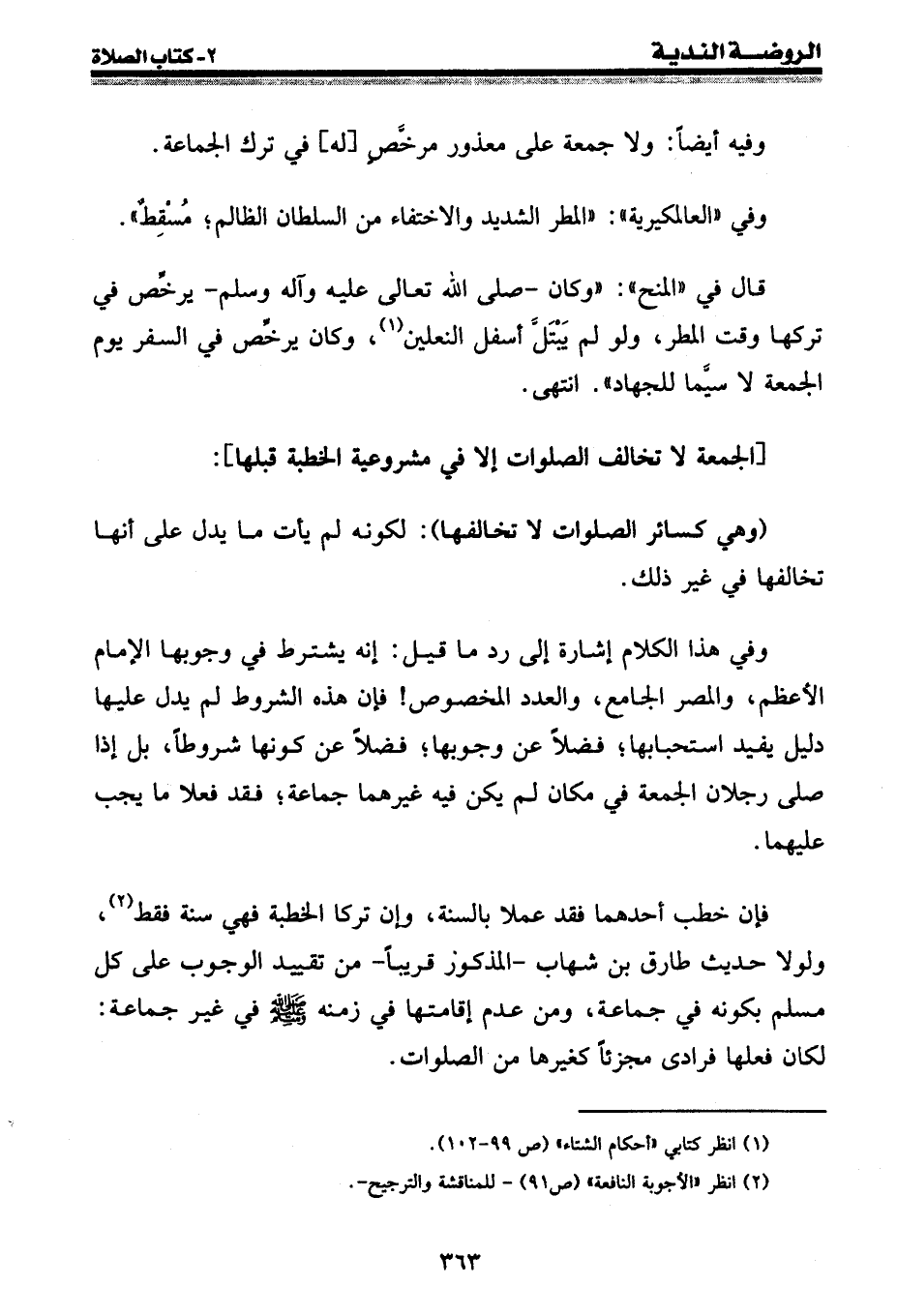قال في " المنح ": " وكان -[صلى الله عليه وسلم]- يرخص في تركها وقت المطر، ولو لم يبتل أسفل النعلين (¬1) ، وكان يرخص في السفر يوم الجمعة لا سيما للجهاد ". انتهى.