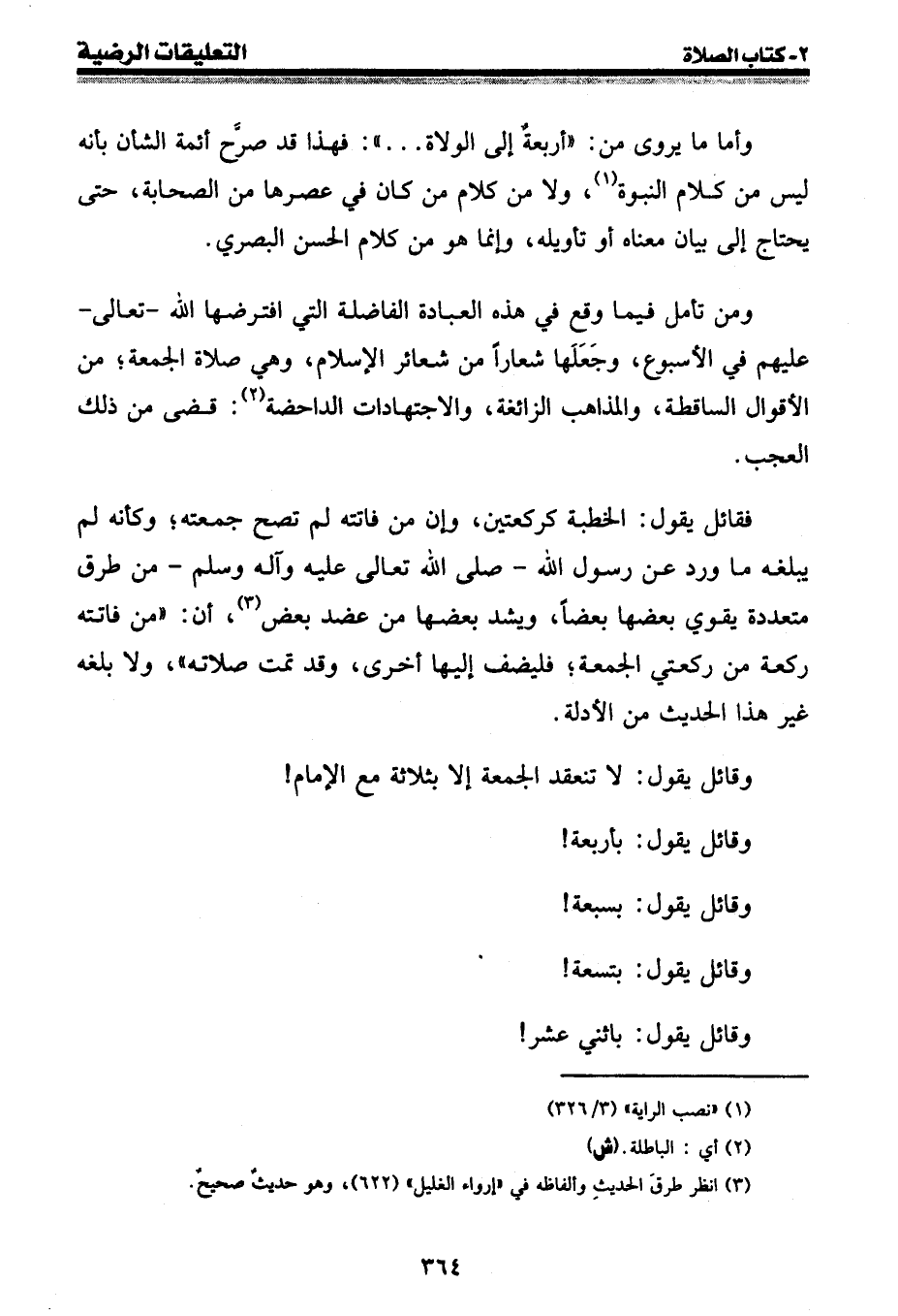 فقائل يقول: الخطبة كركعتين، وإن من فاتته لم تصح جمعته؛ وكأنه لم يبلغه ما ورد عن رسول الله -[صلى الله عليه وسلم]- من طرق متعددة يقوي بعضها بعضا، ويشد بعضها من عضد بعض (¬3) ، أن " من فاتته ركعة من ركعتي الجمعة؛ فليضف إليها أخرى، وقد تمت صلاته "، ولا بلغه غير هذا الحديث من الأدلة.