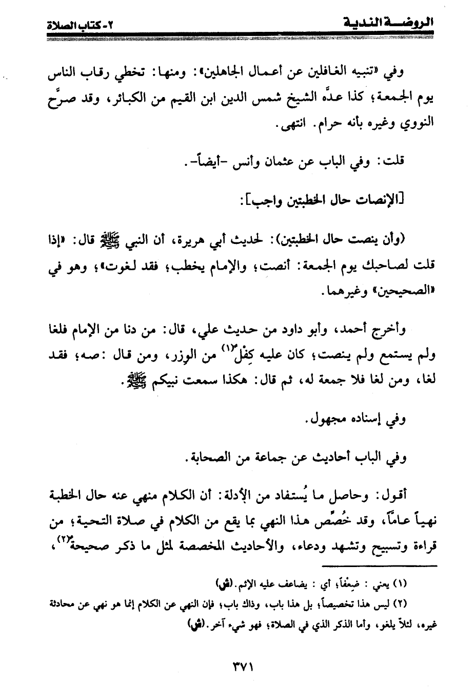 أقول: وحاصل ما يستفاد من الأدلة: أن الكلام منهي عنه حال الخطبة نهيا عاما، وقد خصص هذا النهي بما يقع من الكلام في صلاة التحية؛ من قراءة وتسبيح وتشهد ودعاء، والأحاديث المخصصة لمثل ما ذكر صحيحة (¬2) ،