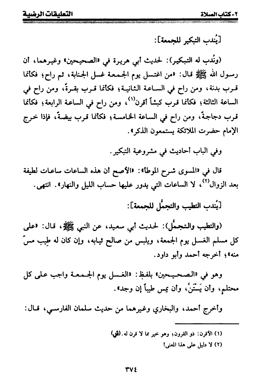 (ونُدب له التبكير) : لحديث أبي هريرة في " الصحيحين " وغيرهما، أن رسول الله [صلى الله عليه وسلم] قال: " من اغتسل يوم الجمعة غسل الجنابة، ثم راح؛ فكأنما قرب بدنة، ومن راح في الساعة الثانية؛ فكأنما قرب بقرة، ومن راح في الساعة الثالثة؛ فكأنما قرب كبشا أقرن (¬1) ، ومن راح في الساعة الرابعة؛ فكأنما قرب دجاجة، ومن راح في الساعة الخامسة؛ فكأنما قرب بيضة، فإذا خرج الإمام حضرت الملائكة يستمعون الذكر ".