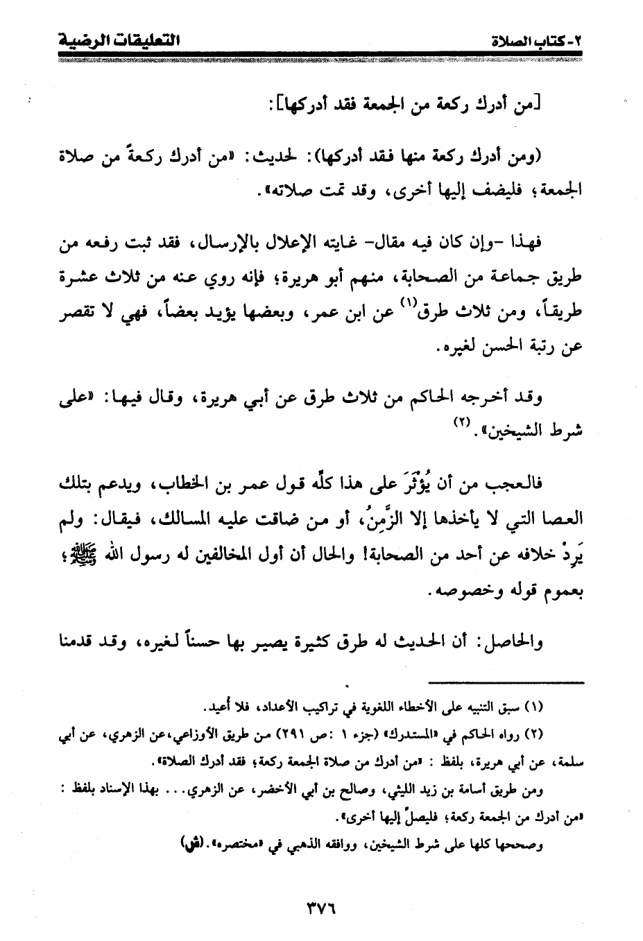(¬2) رواه الحاكم في " المستدرك " (جزء 1: ص 291) من طريق الأوزاعي، عن الزهري، عن أبي سلمة، عن أبي هريرة، بلفظ: " من أدرك من صلاة الجمعة ركعة؛ فقد أدرك الصلاة ".