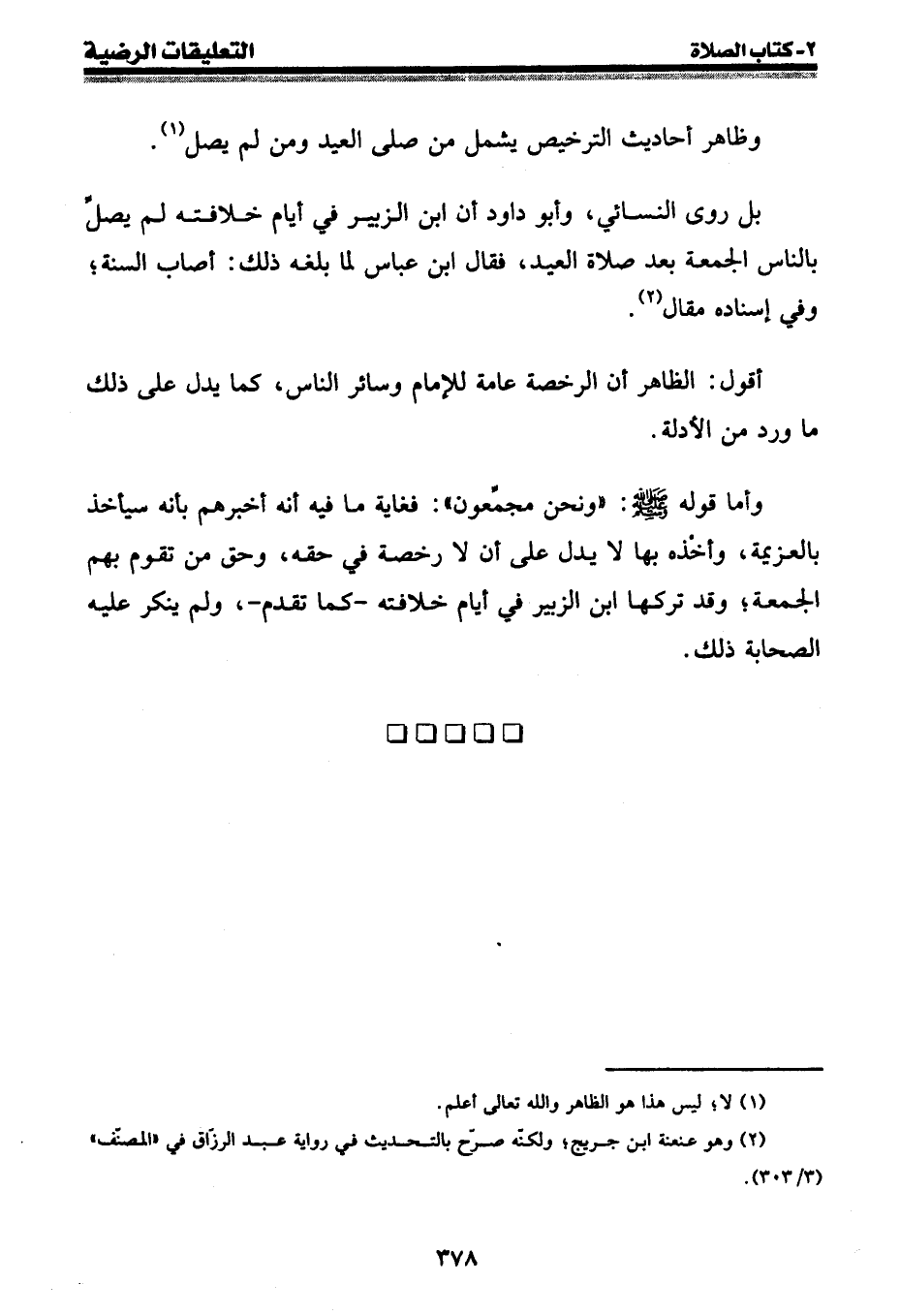 وأما قوله [صلى الله عليه وسلم] : " ونحن مجمعون ": فغاية ما فيه أنه أخبرهم بأنه سيأخذ بالعزيمة، وأخذه بها لا يدل على أن لا رخصة في حقه، وحق من تقوم بهم الجمعة؛ وقد تركها ابن الزبير في أيام خلافته - كما تقدم -، ولم ينكر عليه الصحابة ذلك.