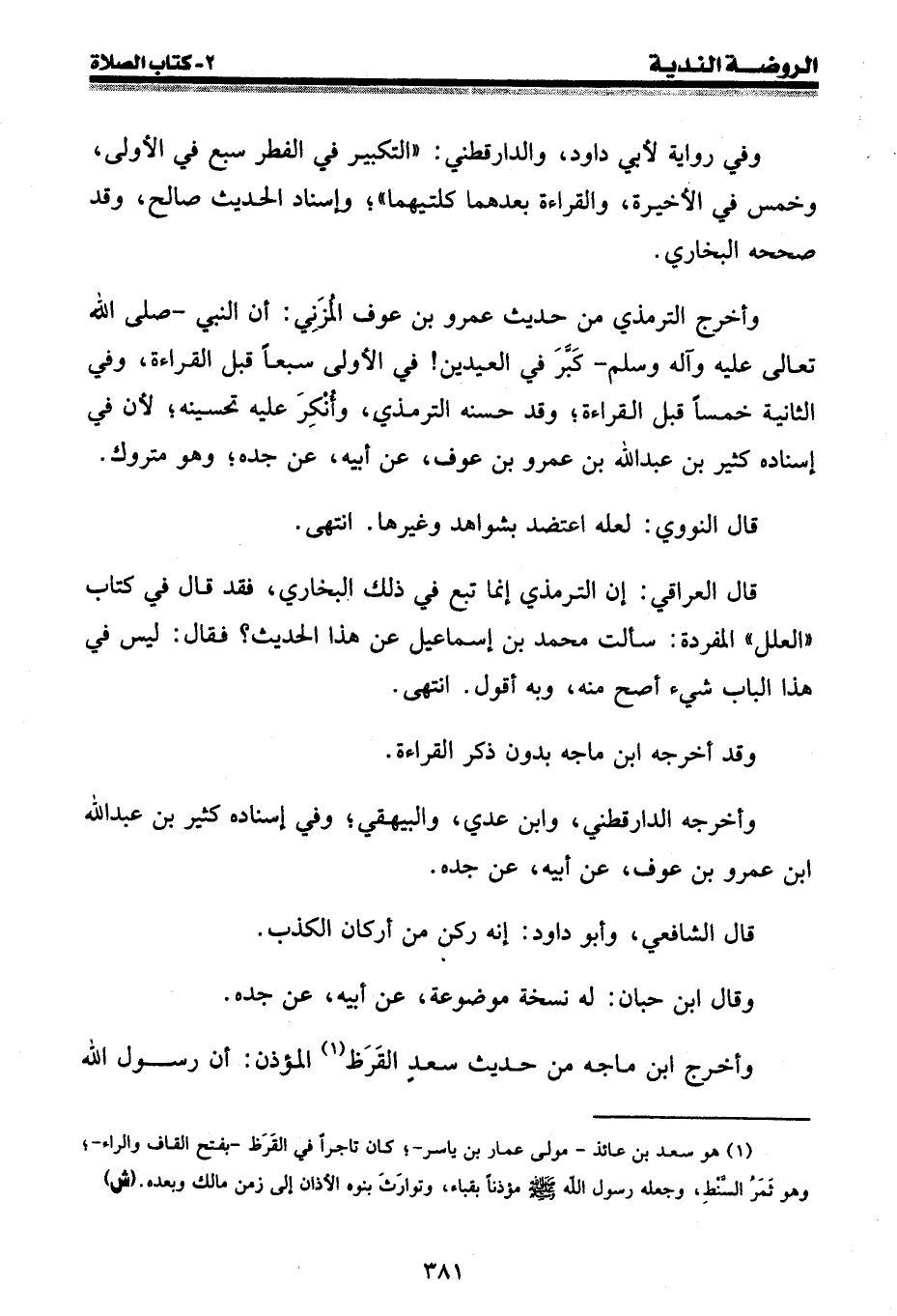وفي رواية لأبي داود، والدارقطني: " التكبير في الفطر سبع في الأولى، وخمس في الأخيرة، والقراءة بعدهما كلتيهما "؛ وإسناد الحديث صالح، وقد صححه البخاري.