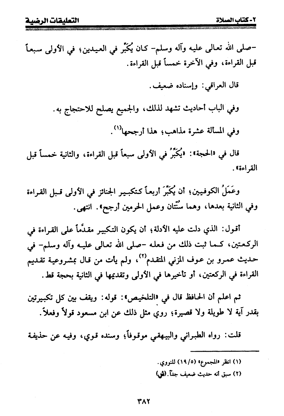 أقول: الذي دلت عليه الأدلة؛ أن يكون التكبير مقدما على القراءة في الركعتين، كما ثبت ذلك من فعله -[صلى الله عليه وسلم]- في حديث عمرو بن عوف المزني المتقدم (¬2) ، ولم يأت من قال بمشروعية تقديم القراءة في الركعتين، أو تأخيرها في الأولى وتقديمها في الثانية بحجة قط.