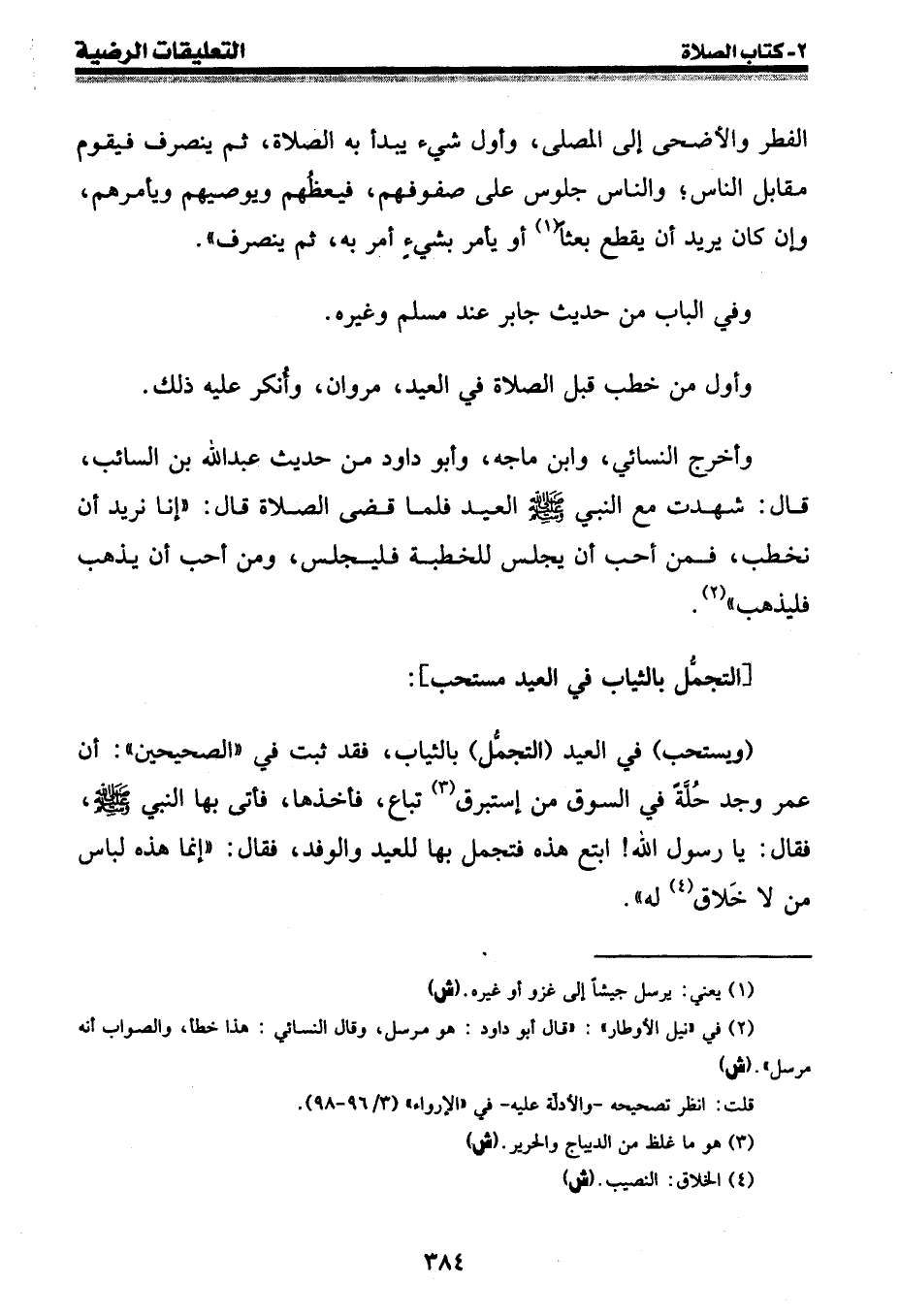 (ويستحب) في العيد (التجمل) بالثياب، فقد ثبت في " الصحيحين ": أن عمر وجد حلة في السوق من إستبرق (¬3) تباع، فأخذها، فأتى بها النبي [صلى الله عليه وسلم] ، فقال: يا رسول الله! ابتع هذه فتجمل بها للعيد والوفد، فقال: " إنما هذه لباس من لا خلاق (¬4) له ".