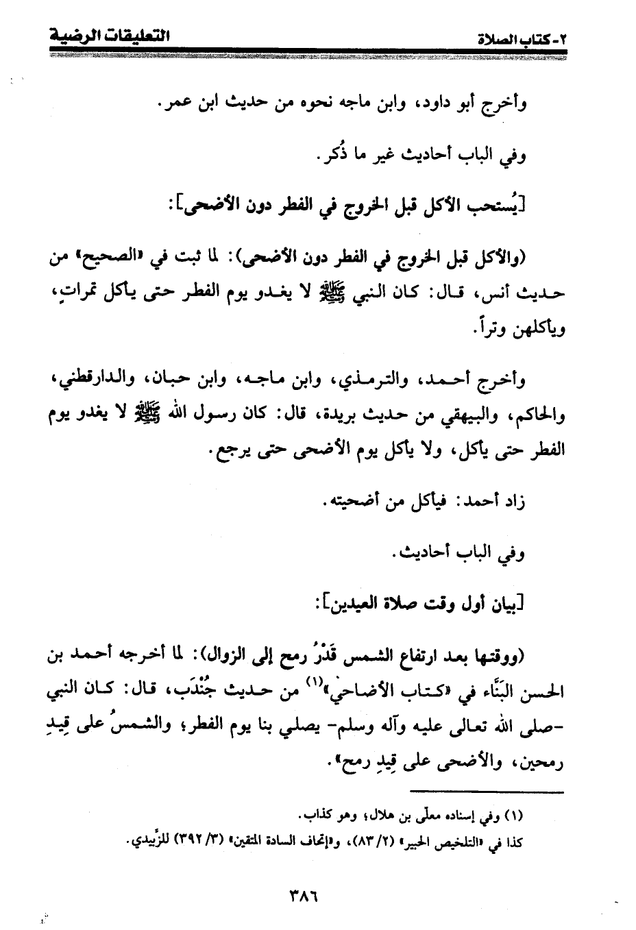 وأخرج أحمد، والترمذي، وابن ماجة، وابن حبان، والدارقطني، والحاكم، والبيهقي من حديث بريدة، قال: كان رسول الله [صلى الله عليه وسلم] لا يغدو يوم الفطر حتى يأكل، ولا يأكل يوم الأضحى حتى يرجع.