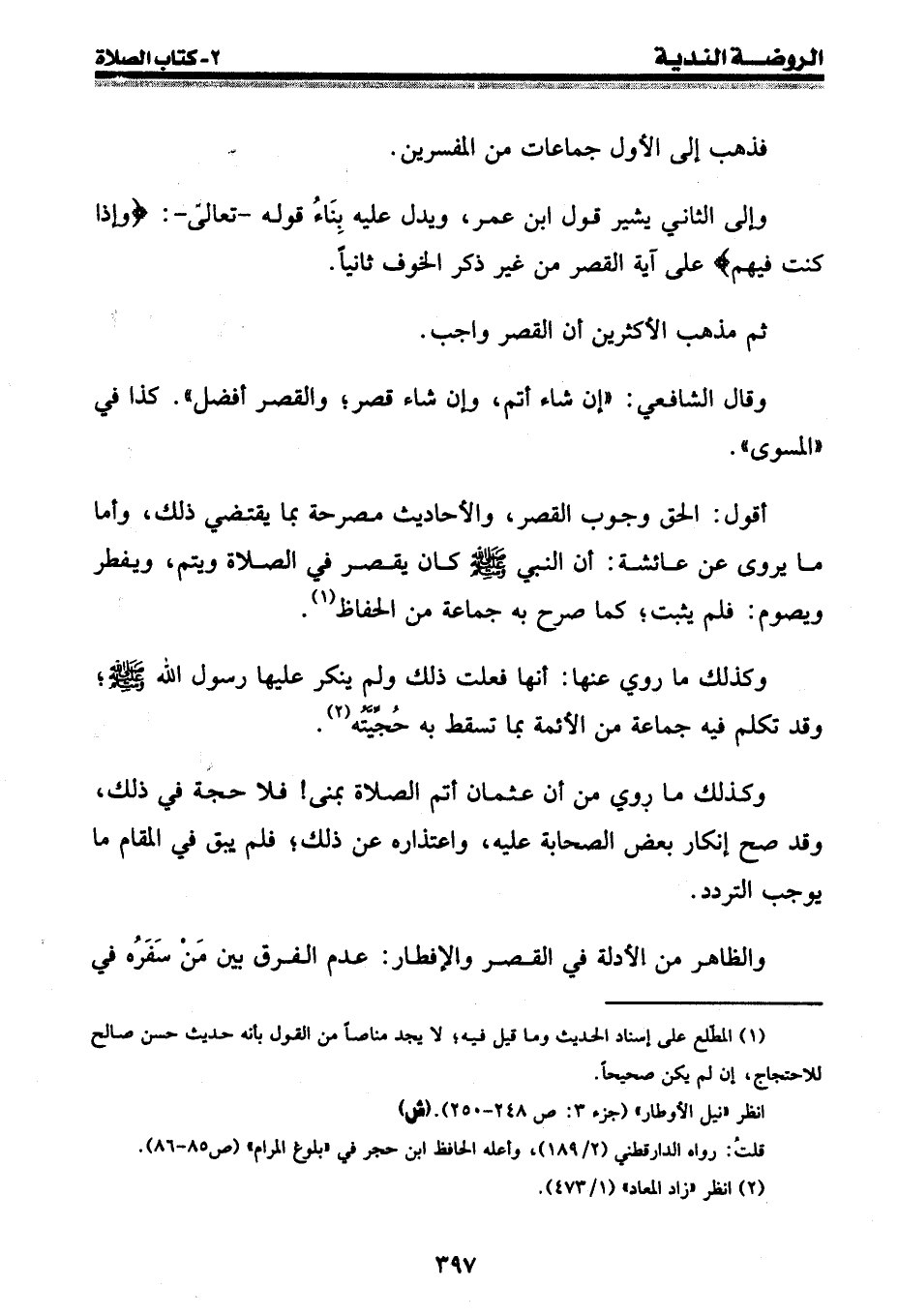 أقول: الحق وجوب القصر، والأحاديث مصرحة بما يقتضي ذلك، وأما ما يروى عن عائشة: أن النبي [صلى الله عليه وسلم] كان يقصر في الصلاة ويتم، ويفطر ويصوم: فلم يثبت؛ كما صرح به جماعة من الحفاظ (¬1) .