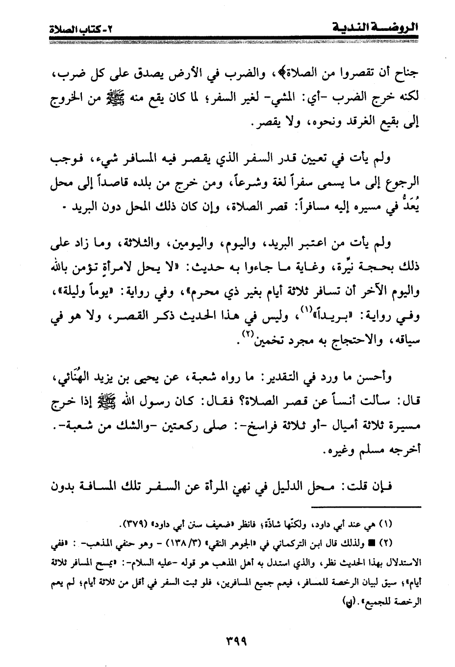 ولم يأت من اعتبر البريد، واليوم، واليومين، والثلاثة، وما زاد على ذلك بحجة نيرة، وغاية ما جاءوا به حديث: " لا يحل لامرأة تؤمن بالله واليوم الآخر أن تسافر ثلاثة أيام بغير ذي محرم "، وفي رواية: " يوما وليلة "، وفي رواية: " بريدا " (¬1) ، وليس في هذا الحديث ذكر القصر، ولا هو في سياقه، والاحتجاج به مجرد تخمين (¬2) .