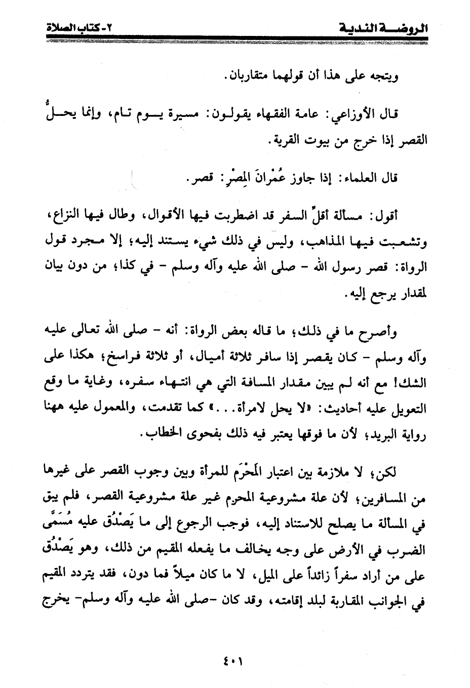 أقول: مسألة أقل السفر قد اضطربت فيها الأقوال، وطال فيها النزاع، وتشعبت فيها المذاهب، وليس في ذلك شيء يستند إليه؛ إلا مجرد قول الرواة: قصر رسول الله -[صلى الله عليه وسلم]- في كذا؛ من دون بيان لمقدار يرجع إليه.
