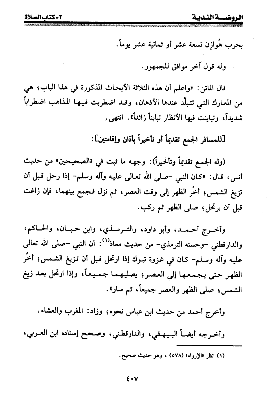 وأخرج أحمد، وأبو داود، والترمذي، وابن حبان، والحاكم، والدارقطني - وحسنه الترمذي - من حديث معاذ (¬1) : أن النبي -[صلى الله عليه وسلم]- كان في غزوة تبوك إذا ارتحل قبل أن تزيغ الشمس؛ أخر الظهر حتى يجمعها إلى العصر؛ يصليهما جميعا، وإذا ارتحل بعد زيغ الشمس؛ صلى الظهر والعصر جميعا، ثم سار ".