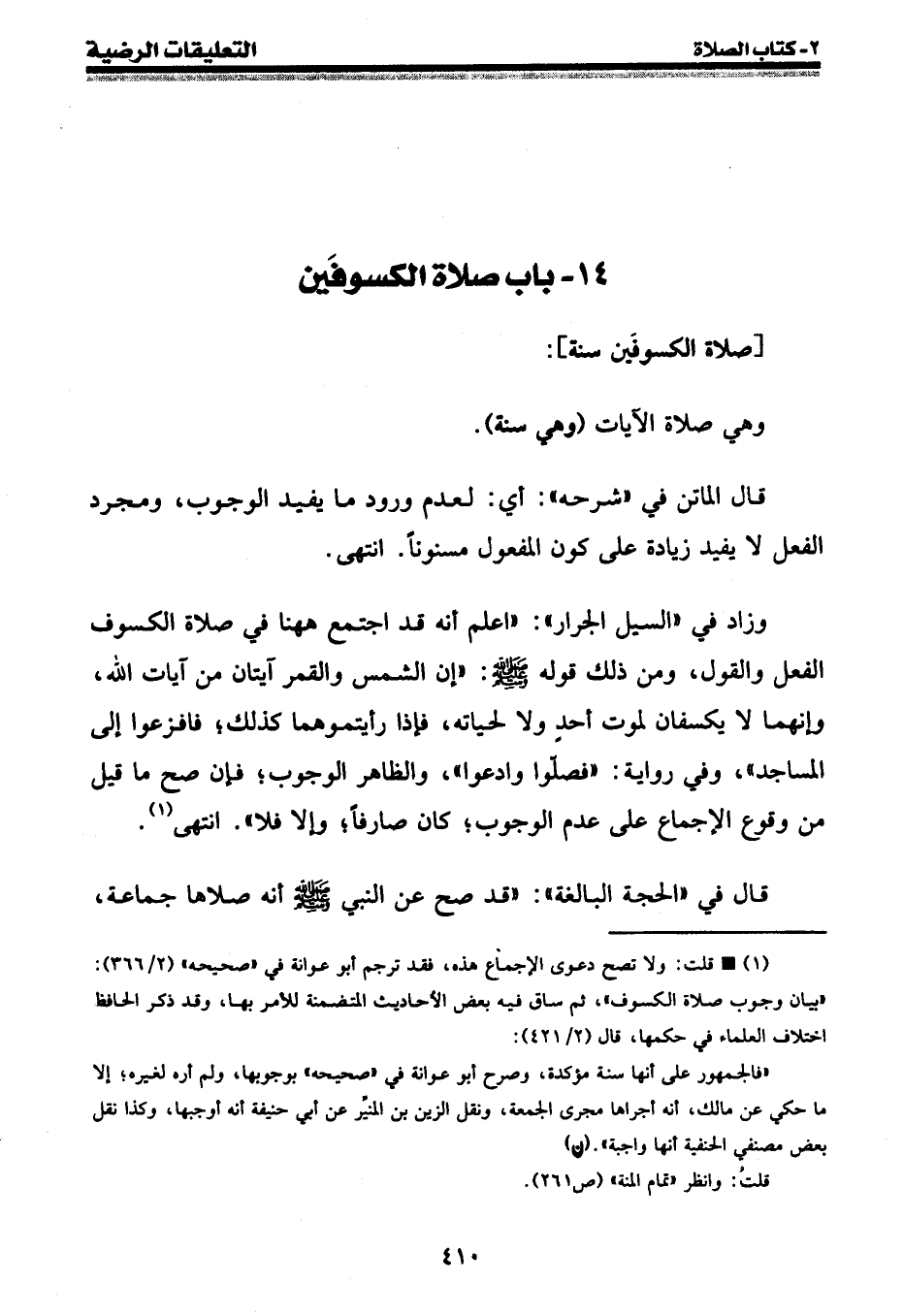 (¬1) • قلت: ولا تصح دعوى الإجماع هذه، فقد ترجم أبو عوانة في " صحيحه " (2 / 366) : " بيان وجوب صلاة الكسوف "، ثم ساق فيه بعض الأحاديث المتضمنة للأمر بها، وقد ذكر الحافظ اختلاف العلماء في حكمها، قال (2 / 421) :