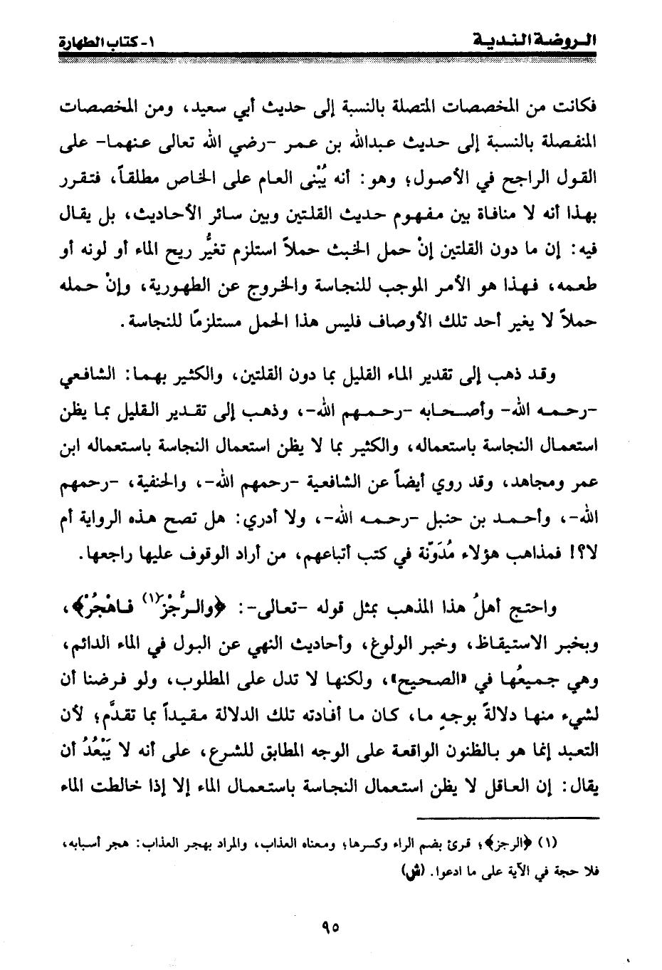 وقد ذهب إلى تقدير الماء القليل بما دون القلتين، والكثير بهما: الشافعي - رحمه الله - وأصحابه رحمهم الله -، وذهب إلى تقدير القليل بما يظن استعمال النجاسة باستعماله، والكثير بما لا يظن استعمال النجاسة باستعماله ابن عمر ومجاهد، وقد روي أيضا عن الشافعية - رحمهم الله -، والحنفية، - رحمهم الله -، وأحمد بن حنبل - رحمه الله -، ولا أدري: هل تصح هذه الرواية أم لا؟ ! فمذاهب هؤلاء مُدونّة في كتب أتباعهم، من أراد الوقوف عليها راجعها.