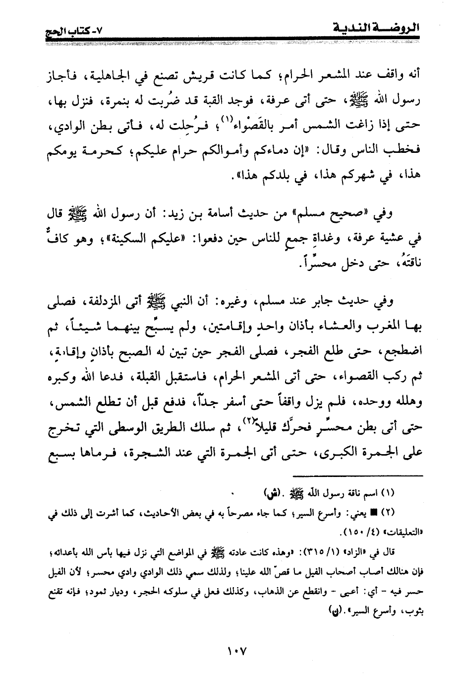 وفي حديث جابر عند مسلم، وغيره: أن النبي صلى الله عليه وسلم أتى المزدلفة، فصلى بها المغرب والعشاء بأذان واحد وإقامتين، ولم يسبّح بينهما شيئا، ثم اضطجع، حتى طلع الفجر، فصلى الفجر حين تبين له الصبح بأذان وإقامة، ثم ركب القصواء، حتى أتى المشعر الحرام، فاستقبل القبلة، فدعا الله وكبره وهلله ووحده، فلم يزل واقفا حتى أسفر جدا، فدفع قبل أن تطلع الشمس، حتى أتى بطن محسر فحرك قليلا (¬2) ، ثم سلك الطريق الوسطى التي تخرج على الجمرة الكبرى، حتى أتى الجمرة التي عند الشجرة، فرماها بسبع