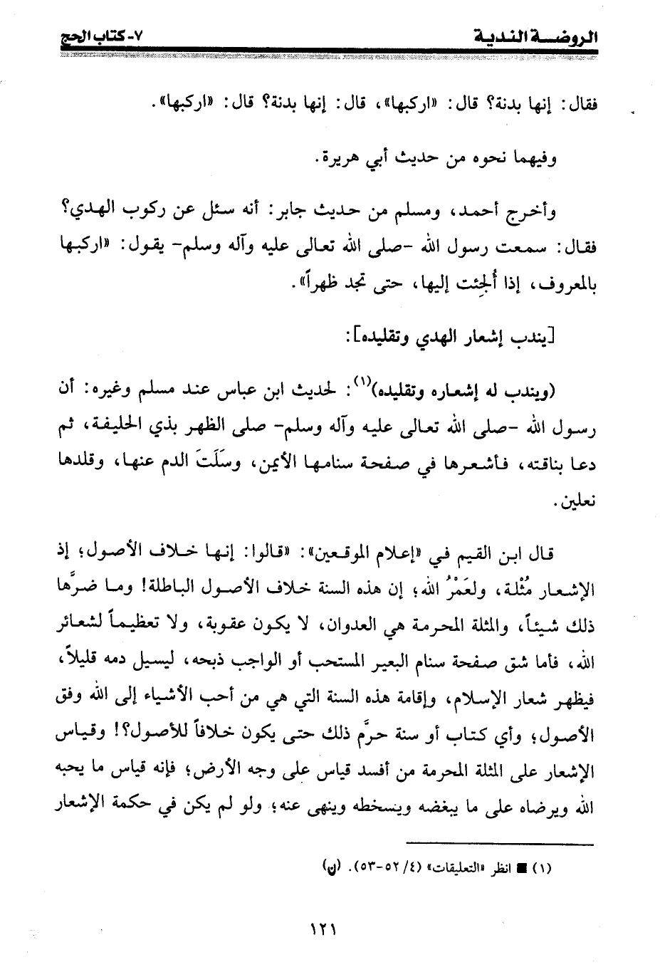 قال ابن القيم في " إعلام الموقعين ": " قالوا: إنها خلاف الأصول؛ إذ الإشعار مثلة، ولعمر الله؛ إن هذه السنة خلاف الأصول الباطلة {وما ضرها ذلك شيئا، والمثلة المحرمة هي العدوان، لا يكون عقوبة، ولا تعظيما لشعائر الله، فأما شق صفحة سنام البعير المستحب أو الواجب ذبحه، ليسيل دمه قليلا، فيظهر شعار الإسلام، وإقامة هذه السنة التي هي من أحب الأشياء إلى الله وفق الأصول؛ وأي كتاب أو سنة حرم ذلك حتى يكون خلافا للأصول؟} وقياس الإشعار على المثلة المحرمة من أفسد قياس على وجه الأرض؛ فإنه قياس ما يحبه الله ويرضاه على ما يبغضه ويسخطه وينهى عنه؛ ولو لم يكن في حكمة الإشعار
