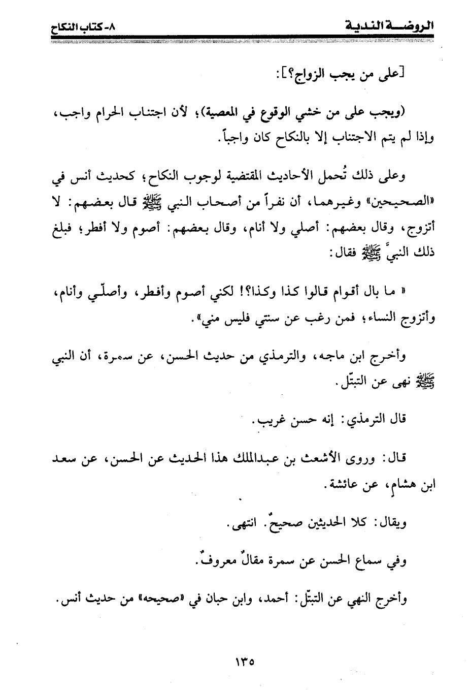 وعلى ذلك تحمل الأحاديث المقتضية لوجوب النكاح؛ كحديث أنس في " الصحيحين " وغيرهما، أن نفرا من أصحاب النبي صلى الله عليه وسلم قال بعضهم: لا أتزوج، وقال بعضهم: أصلي ولا أنام، وقال بعضهم: أصوم ولا أفطر؛ فبلغ ذلك النبي صلى الله عليه وسلم فقال: