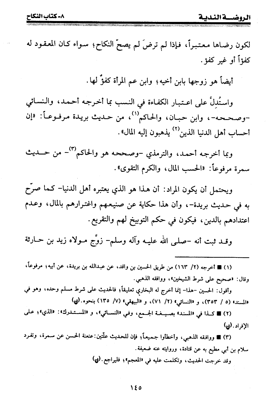 واستدل على اعتبار الكفاءة في النسب بما أخرجه أحمد، والنسائي - وصححه -، وابن حبان، والحاكم (¬1) ، من حديث بريدة مرفوعا: " إن أحساب أهل الدنيا الذين (¬2) يذهبون إليه المال ".