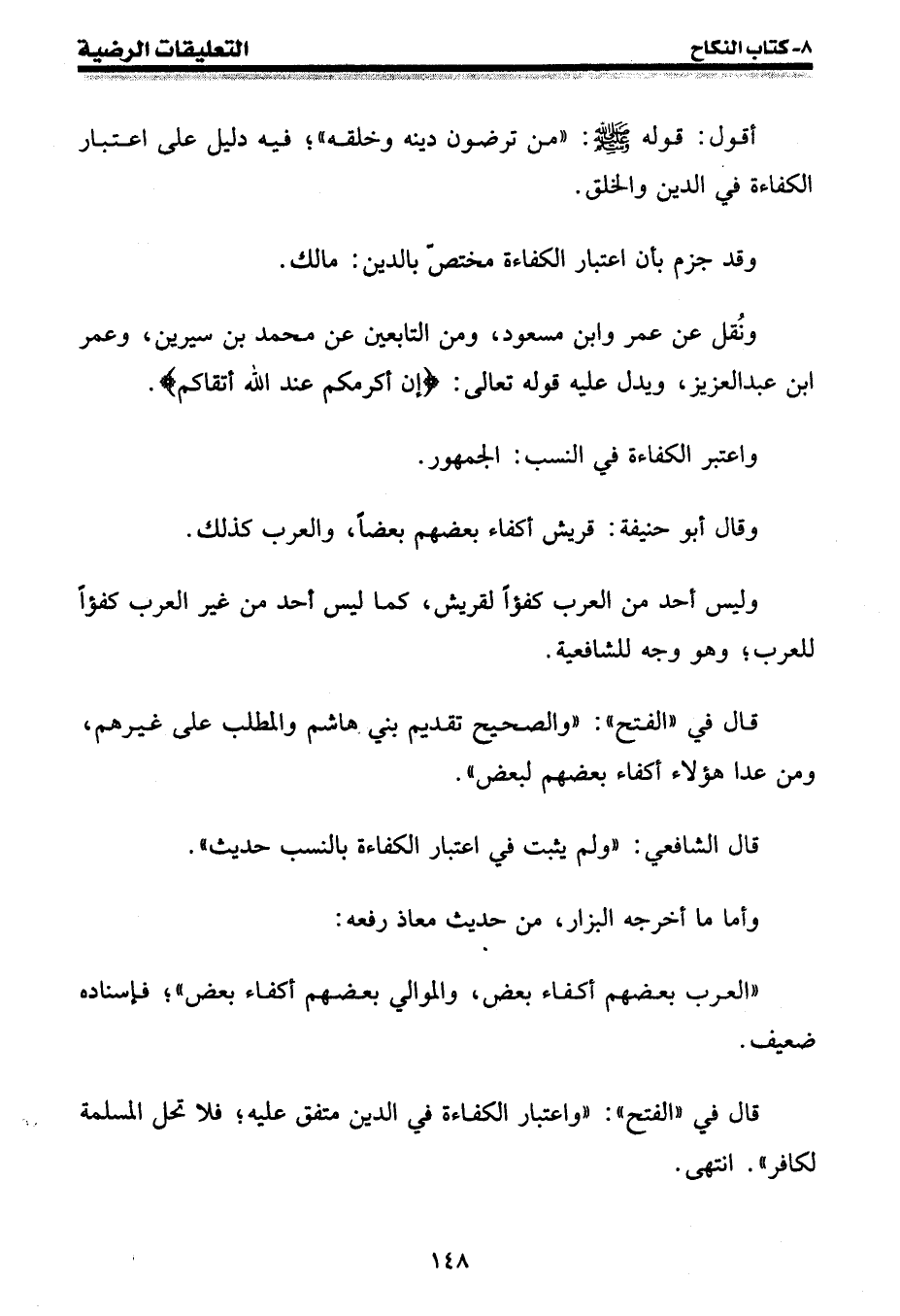 قال الشافعي: " ولم يثبت في اعتبار الكفاءة بالنسب حديث ".