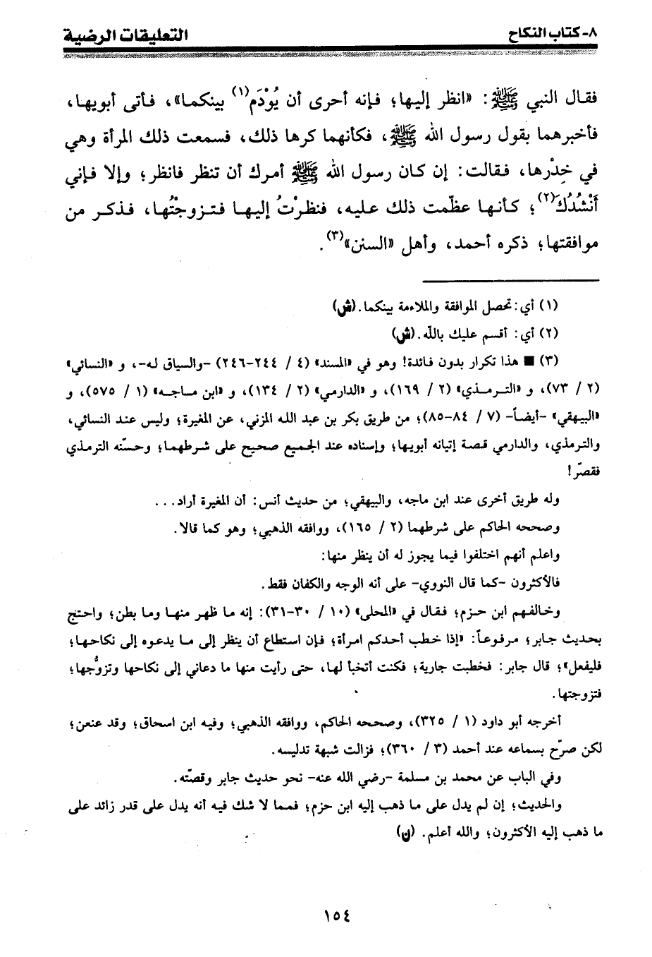فقال النبي صلى الله عليه وسلم: " انظر إليها؛ فإنه أحرى أن يودم (¬1) بينكما "، فأتى أبويها، فأخبرهما بقول رسول الله صلى الله عليه وسلم، فكأنهما كرها ذلك، فسمعت ذلك المرأة وهي في خدرها، فقالت: إن كان رسول الله صلى الله عليه وسلم أمرك أن تنظر فانظر؛ وإلا فإني أنشدك (¬2) ؛ كأنها عظمت ذلك عليه، فنظرت إليها فتزوجتها، فذكر من موافقتها؛ ذكره أحمد، وأهل " السنن " (¬3) .