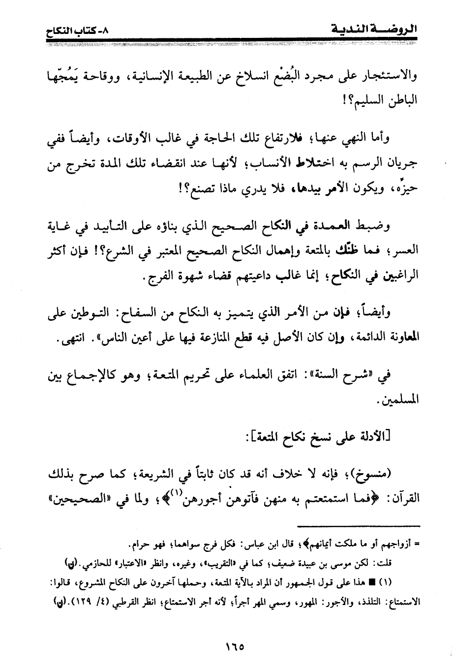 وضبط العمدة في النكاح الصحيح الذي بناؤه على التأبيد في غاية العسر؛ فما ظنك بالمتعة وإهمال النكاح الصحيح المعتبر في الشرع؟ ! فإن أكثر الراغبين في النكاح؛ إنما غالب داعيتهم قضاء شهوة الفرج.