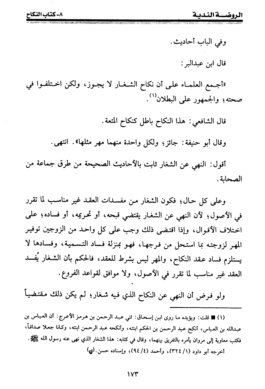 (¬1) • قلت: ويؤيده ما روى ابن إسحاق: ثني عبد الرحمن بن هرمز الأعرج: أن العباس بن عبد الله بن العباس، أنكح عبد الرحمن بن الحكم ابنته، وأنكحه عبد الرحمن ابنته، وكانا جعلا صداقا، فكتب معاوية إلى مروان يأمره بالتفريق بينهما، وقال في كتابه: هذا الشغار الذي نهى عنه رسول الله صلى الله عليه وسلم.