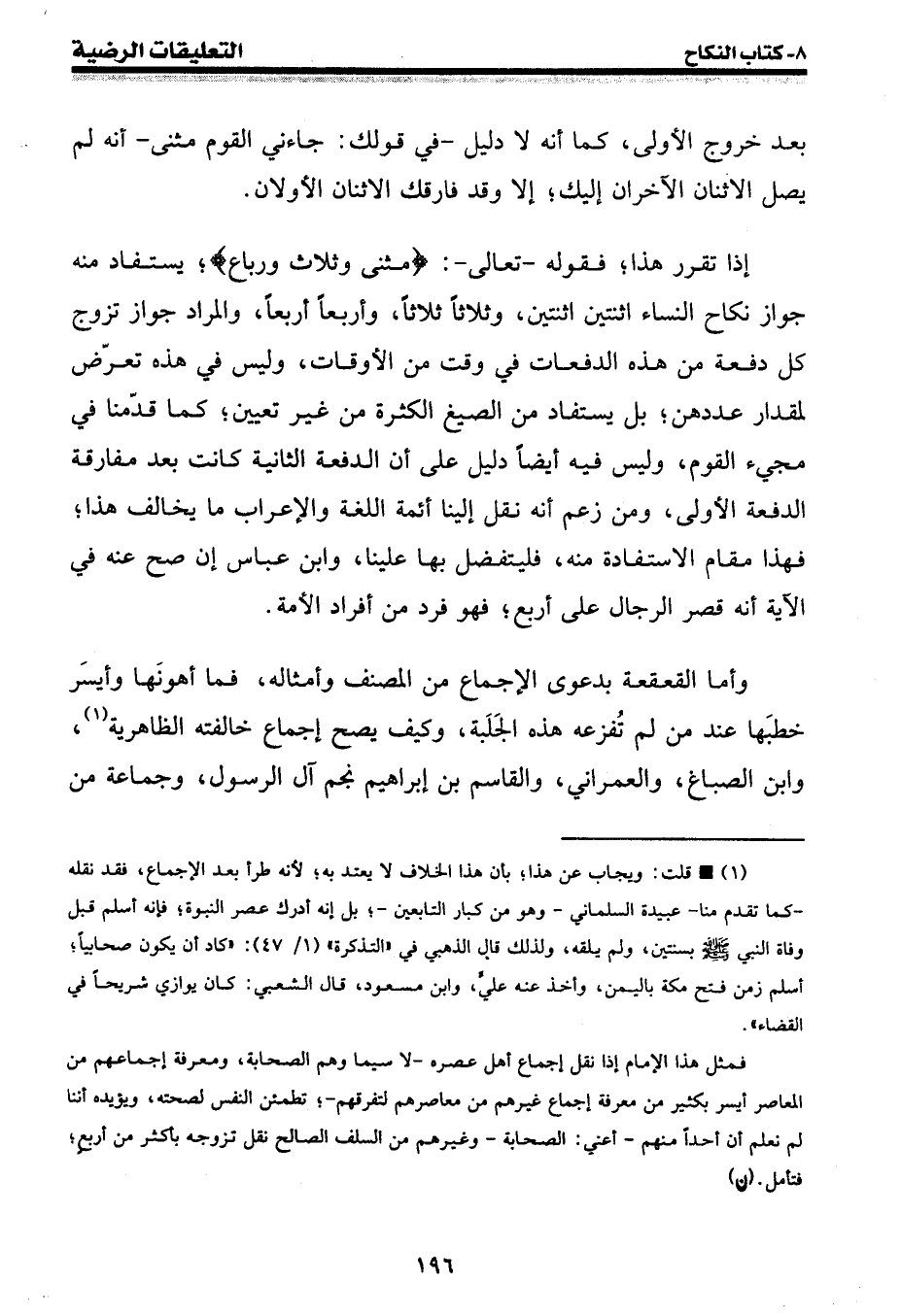 فمثل هذا الإمام إذا نقل إجماع أهل عصره - لا سيما وهم الصحابة، ومعرفة إجماعهم من المعاصر أيسر بكثير من معرفة إجماع غيرهم من معاصرهم لتفرقهم -؛ تطمئن النفس لصحته، ويؤيده أننا لم نعلم أن أحدا منهم - أعني: الصحابة - وغيرهم من السلف الصالح نقل تزوجه بأكثر من أربع؛ فتأمل. (ن)