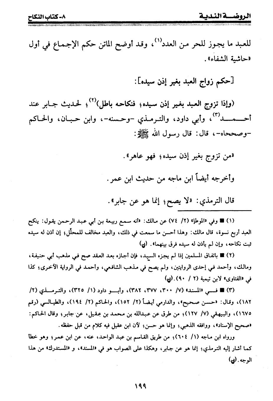 (¬2) • باتفاق المسلمين إذا لم يجزه السيد، فإن أجازه بعد العقد صح في مذهب أبي حنيفة، ومالك، وأحمد في إحدى الروايتين، ولم يصح في مذهب الشافعي، وأحمد في الرواية الأخرى؛ كذا في " الفتاوى " لابن تيمية (2 / 90) . (ن)
