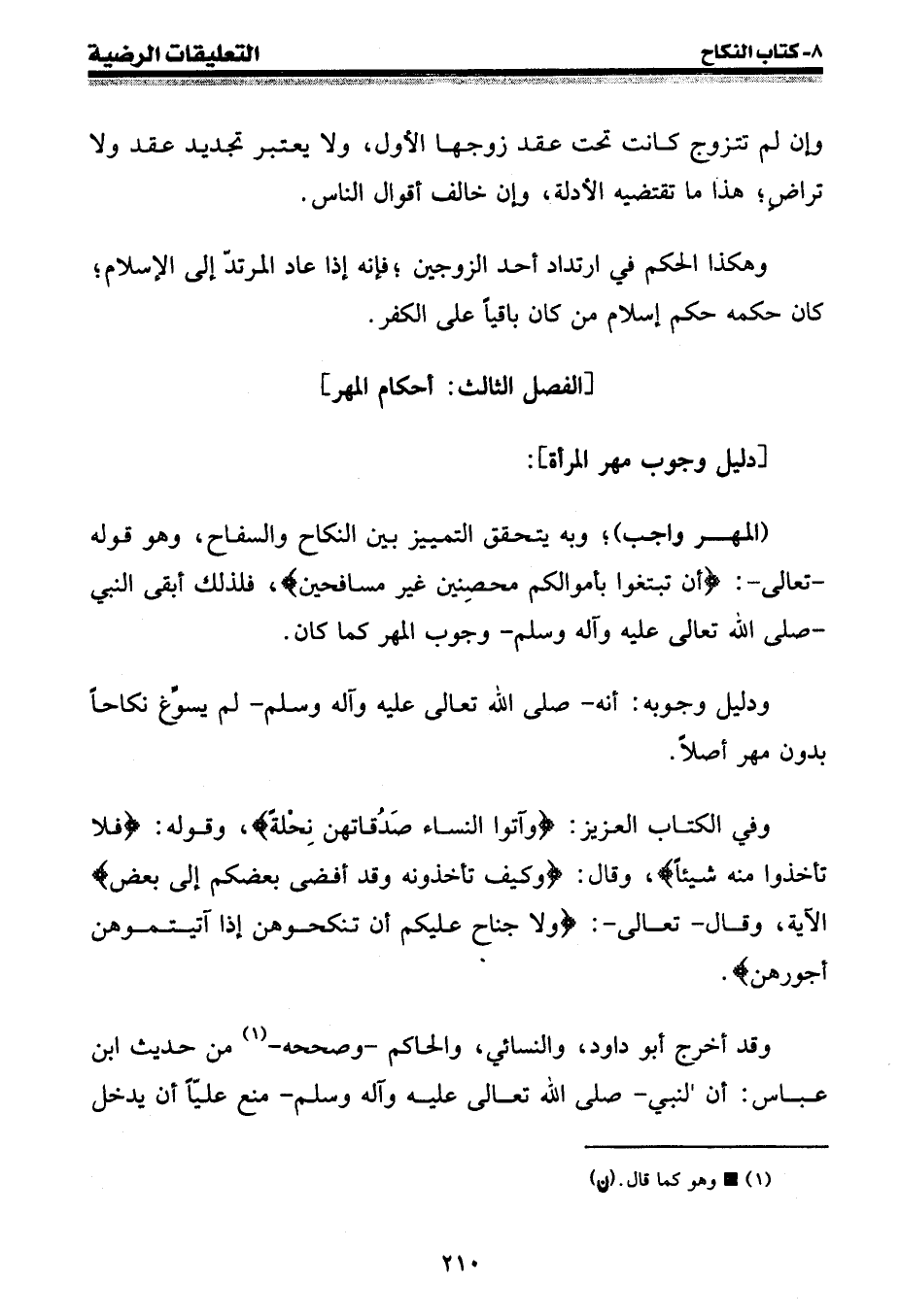 وفي الكتاب العزيز: {وآتوا النساء صدقاتهن نحلة} ، وقوله: {فلا تأخذوا منه شيئا} ، وقال: {وكيف تأخذونه وقد أفضى بعضكم إلى بعض} الآية، وقال - تعالى -: {ولا جناح عليكم أن تنكحوهن إذا آتيتموهن أجورهن} .