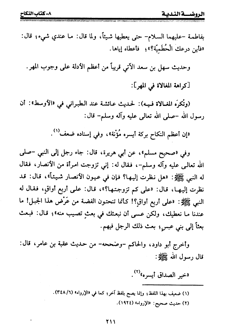 " إن أعظم النكاح بركة أيسره مؤنة "، وفي إسناده ضعف (¬1) .