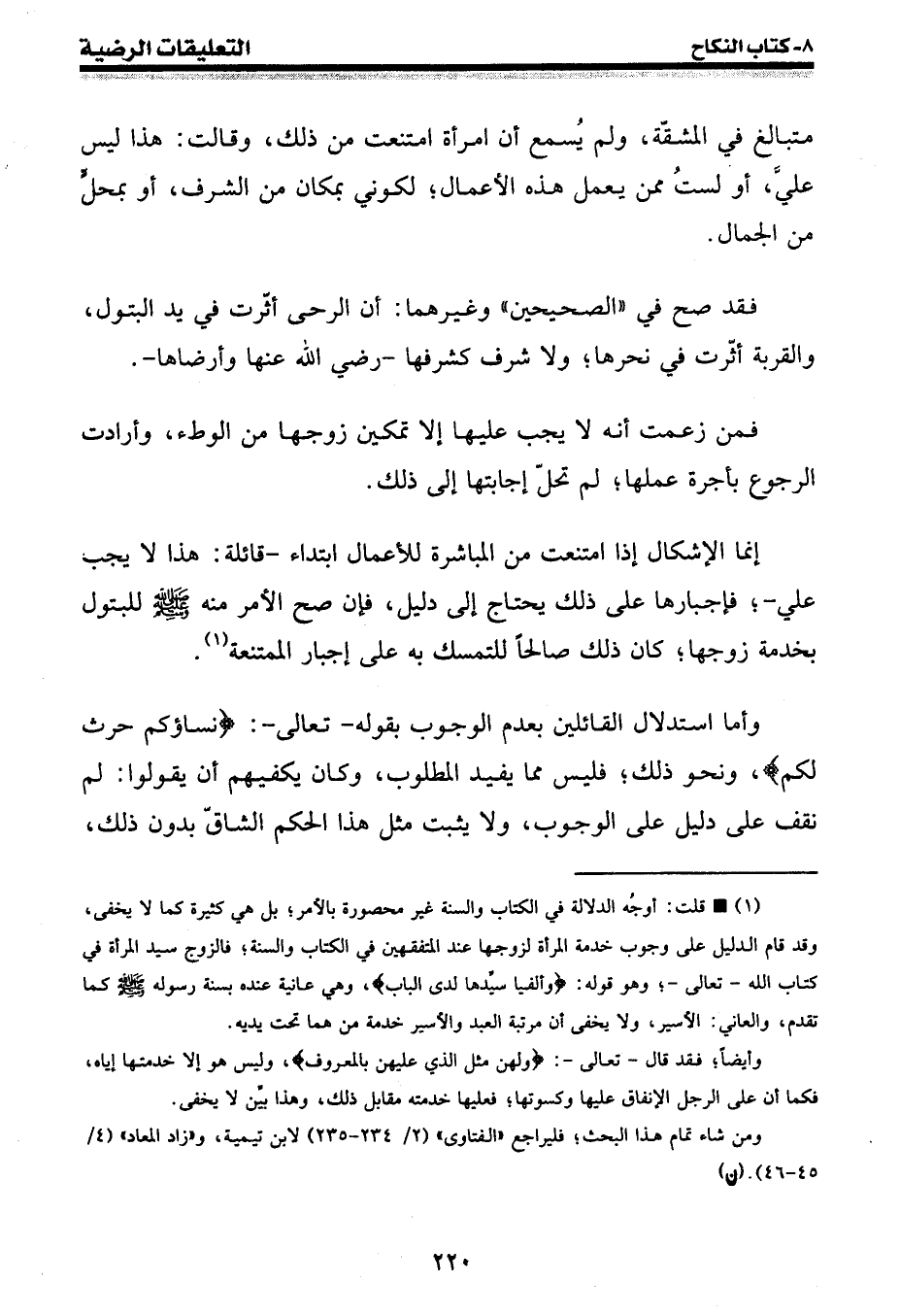 (¬1) • قلت: أوجه الدلالة في الكتاب والسنة غير محصورة بالأمر؛ بل هي كثيرة كما لا يخفى، وقد قام الدليل على وجوب خدمة المرأة لزوجها عند المتفقهين في الكتاب والسنة؛ فالزوج سيد المرأة في كتاب الله - تعالى -؛ وهو قوله: {وألفيا سيدها لدى الباب} ، وهي عانية عنده بسنة رسوله صلى الله عليه وسلم كما تقدم، والعاني: الأسير، ولا يخفى أن مرتبة العبد والأسير خدمة من هما تحت يديه.