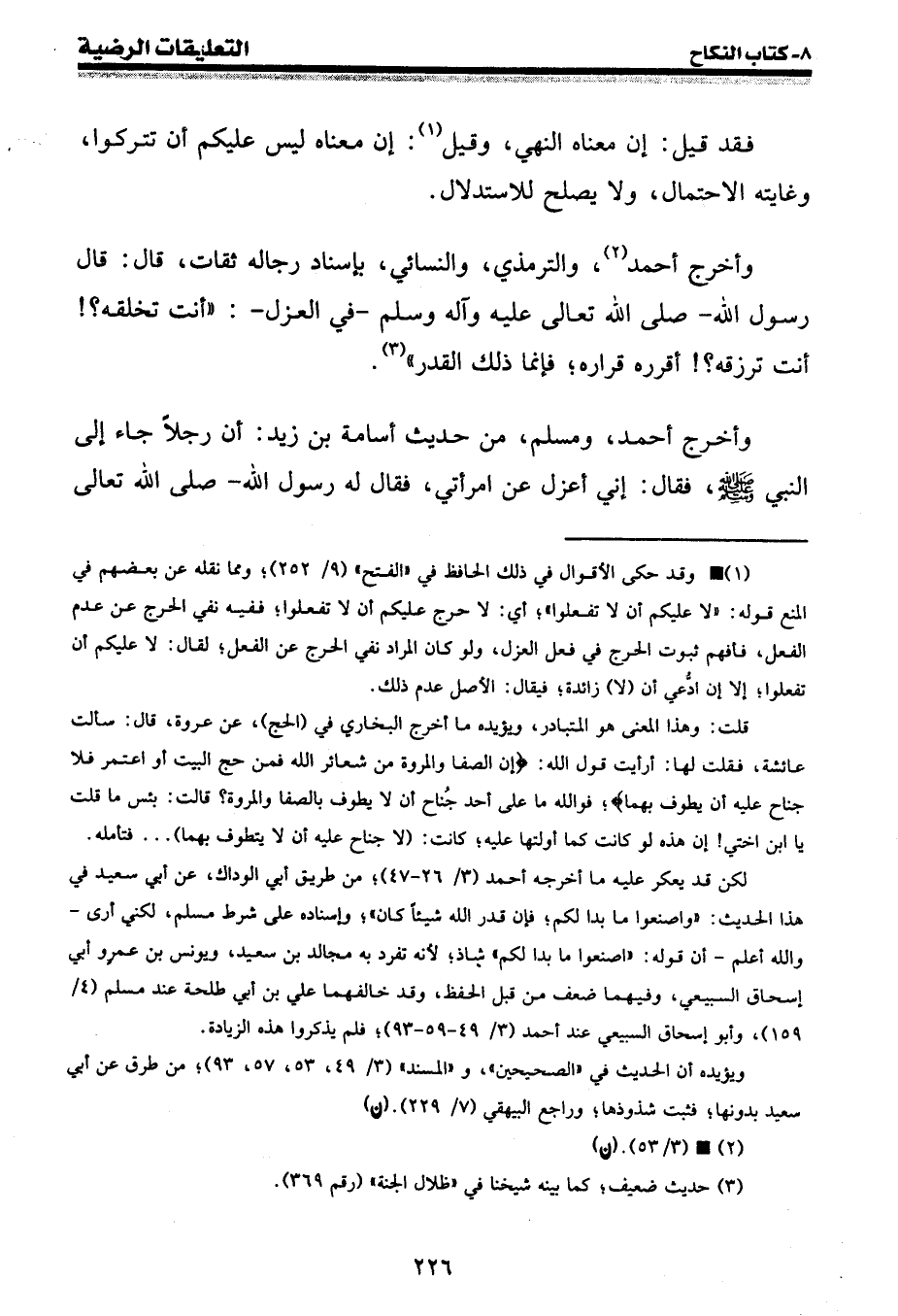 (¬1) • وقد حكى الأقوال في ذلك الحافظ في " الفتح " (9 / 252) ؛ ومما نقله عن بعضهم في المنع قوله: " لا عليكم أن لا تفعلوا "؛ أي: لا حرج عليكم أن لا تفعلوا؛ ففيه نفي الحرج عن عدم الفعل، فأفهم ثبوت الحرج في فعل العزل، ولو كان المراد نفي الحرج عن الفعل؛ لقال: لا عليكم أن تفعلوا؛ إلا إن ادعي أن (لا) زائدة؛ فيقال: الأصل عدم ذلك.