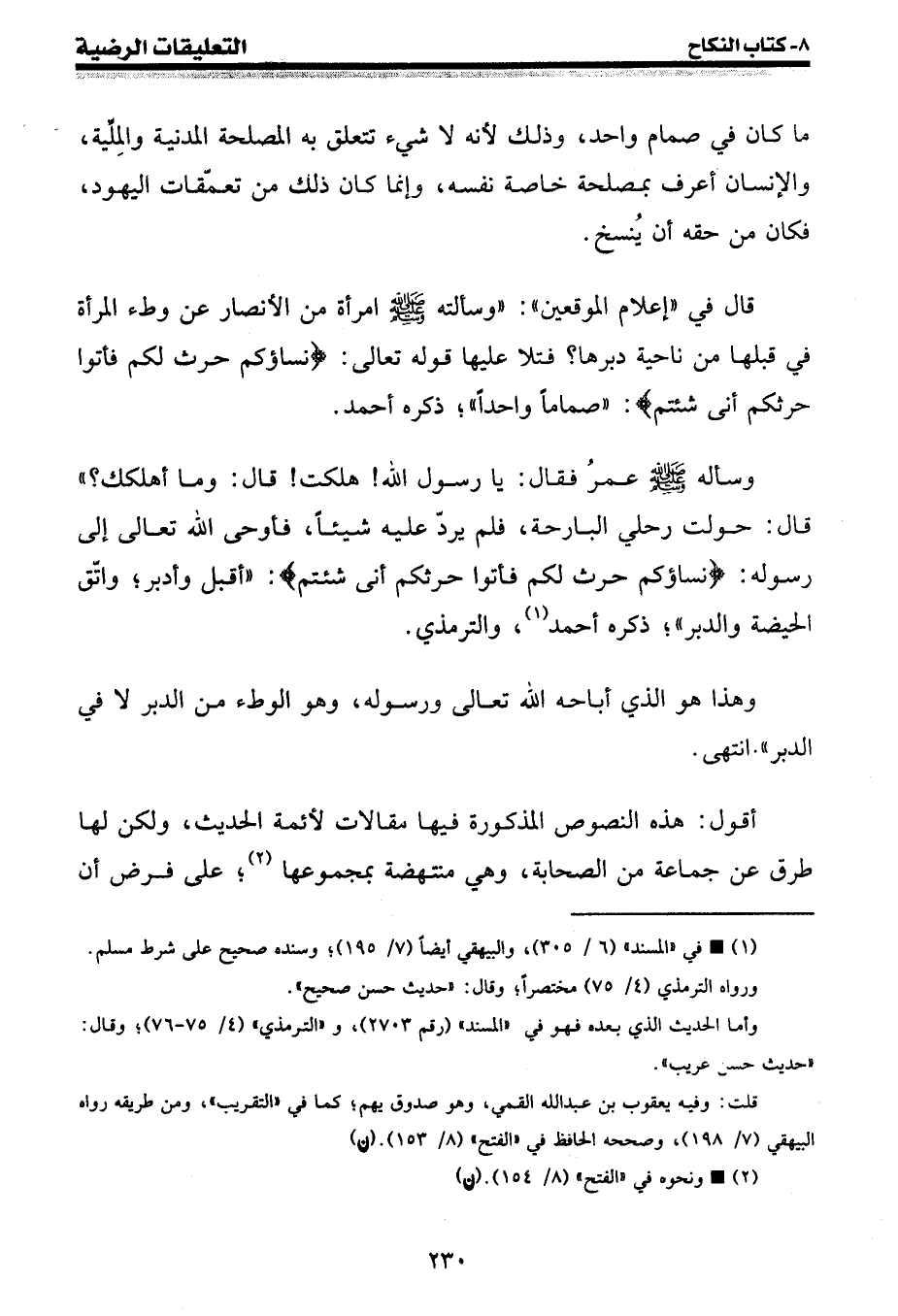 وسأله صلى الله عليه وسلم عمر فقال: يا رسول الله {هلكت} قال: وما أهلكك؟ " قال: حولت رحلي البارحة، فلم يرد عليه شيئا، فأوحى الله تعالى إلى رسوله: {نساؤكم حرث لكم فأتوا حرثكم أنى شئتم} : " أقبل وأدبر؛ واتق الحيضة والدبر "؛ ذكره أحمد (¬1) ، والترمذي.