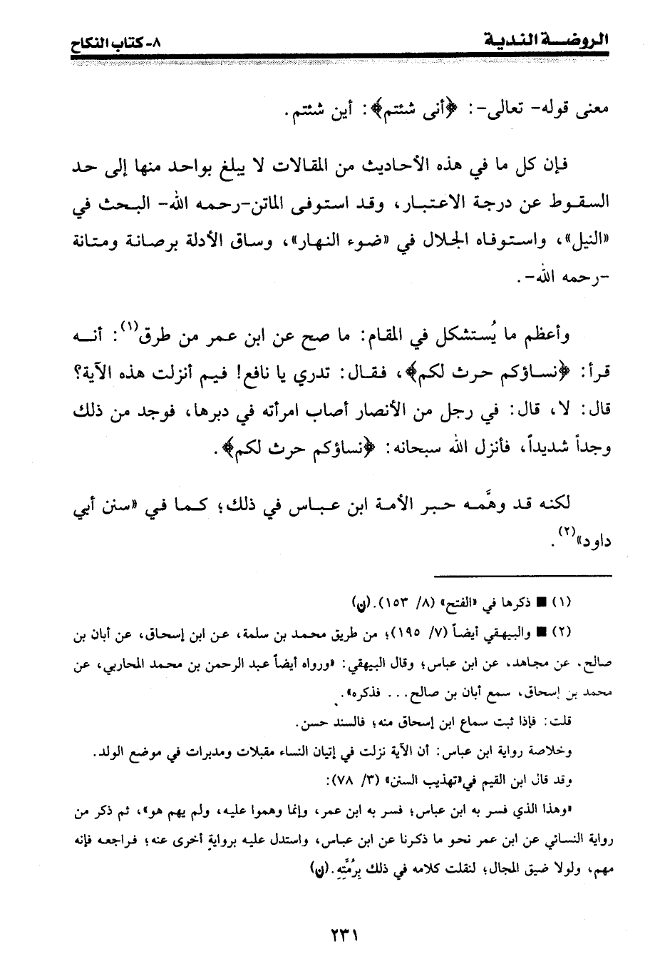 وأعظم ما يستشكل في المقام: ما صح عن ابن عمر من طرق (¬1) : أنه قرأ: {نساؤكم حرث لكم} ، فقال: تدري يا نافع! فيم أنزلت هذه الآية؟ قال: لا، قال: في رجل من الأنصار أصاب امرأته في دبرها، فوجد من ذلك وجدا شديدا، فأنزل الله سبحانه: {نساؤكم حرث لكم} .