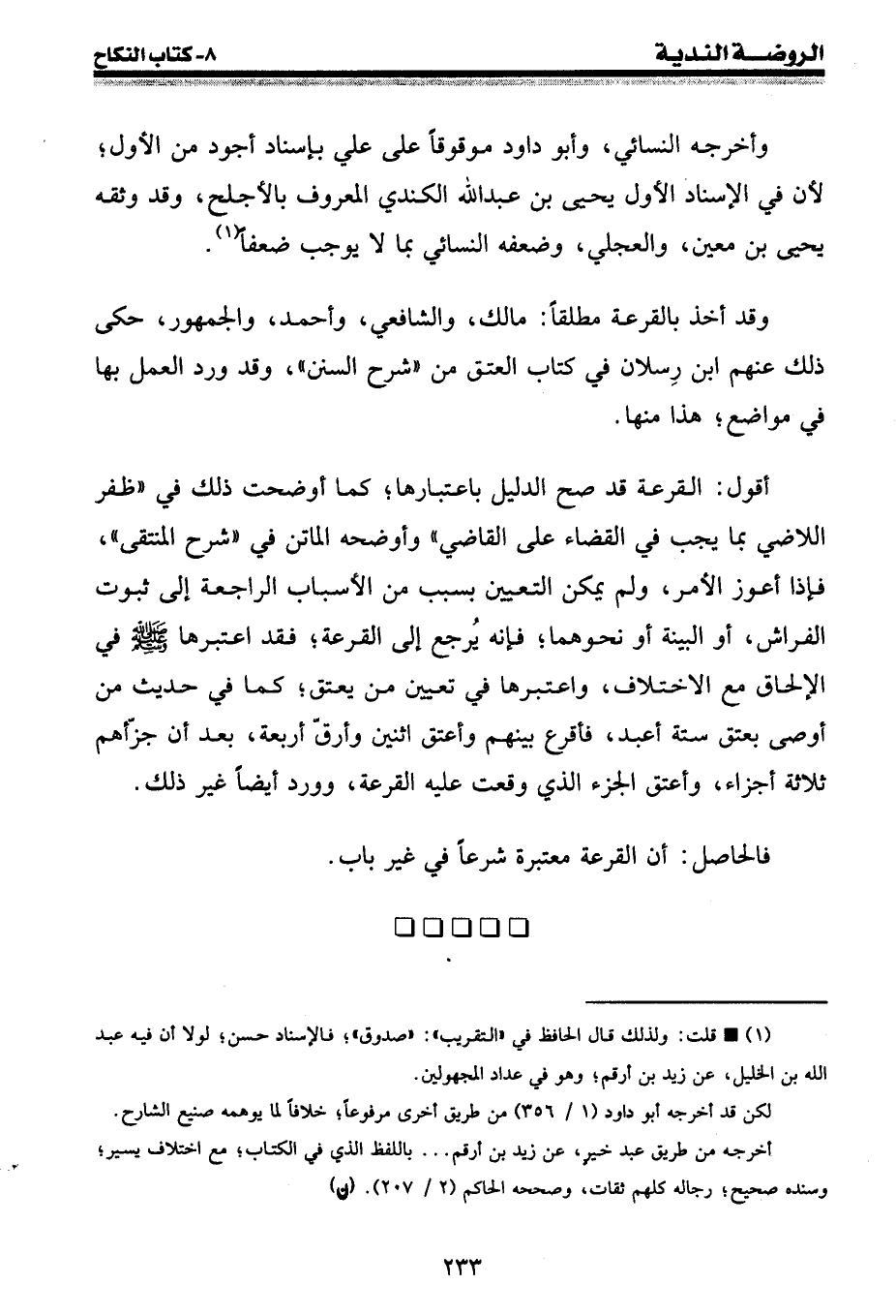 أقول: القرعة قد صح الدليل باعتبارها؛ كما أوضحت ذلك في " ظفر اللاضي بما يجب في القضاء على القاضي " وأوضحه الماتن في " شرح المنتقى "، فإذا أعوز الأمر، ولم يمكن التعيين بسبب من الأسباب الراجعة إلى ثبوت الفراش، أو البينة أو نحوهما؛ فإنه يرجع إلى القرعة؛ فقد اعتبرها صلى الله عليه وسلم في الإلحاق مع الاختلاف، واعتبرها في تعيين من يعتق؛ كما في حديث من أوصى بعتق ستة أعبد، فأقرع بينهم وأعتق اثنين وأرق أربعة، بعد أن جزأهم ثلاثة أجزاء، وأعتق الجزء الذي وقعت عليه القرعة، وورد أيضا غير ذلك.