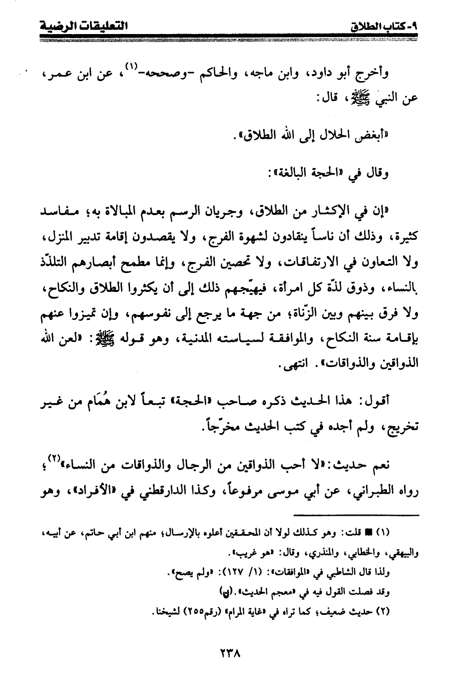" إن في الإكثار من الطلاق، وجريان الرسم بعدم المبالاة به؛ مفاسد كثيرة، وذلك أن ناسا ينقادون لشهوة الفرج، ولا يقصدون إقامة تدبير المنزل، ولا التعاون في الارتفاقات، ولا تحصين الفرج، وإنما مطمح أبصارهم التلذذ بالنساء، وذوق لذة كل امرأة، فيهيجهم ذلك إلى أن يكثروا الطلاق والنكاح، ولا فرق بينهم وبين الزناة؛ من جهة ما يرجع إلى نفوسهم، وإن تميزوا عنهم بإقامة سنة النكاح، والموافقة لسياسته المدنية، وهو قوله صلى الله عليه وسلم: " لعن الله الذواقين والذواقات ". انتهى.