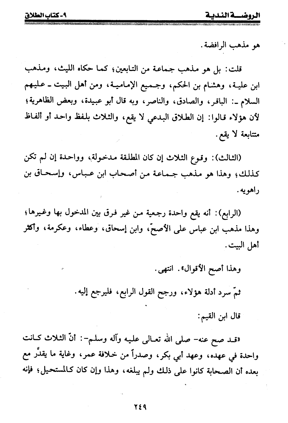 قلت: بل هو مذهب جماعة من التابعين؛ كما حكاه الليث، ومذهب ابن علية، وهشام بن الحكم، وجميع الإمامية، ومن أهل البيت - عليهم السلام -: الباقر، والصادق، والناصر، وبه قال أبو عبيدة، وبعض الظاهرية؛ لأن هؤلاء قالوا: إن الطلاق البدعي لا يقع، والثلاث بلفظ واحد أو ألفاظ متتابعة لا يقع.