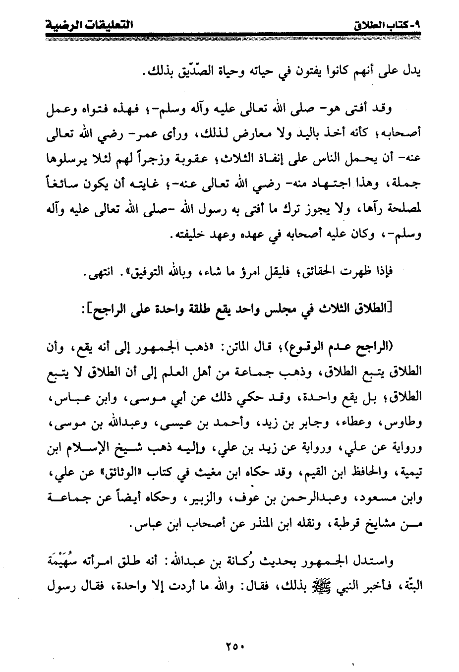 (الراجح عدم الوقوع) ؛ قال الماتن: " ذهب الجمهور إلى أنه يقع، وأن الطلاق يتبع الطلاق، وذهب جماعة من أهل العلم إلى أن الطلاق لا يتبع الطلاق؛ بل يقع واحدة، وقد حكي ذلك عن أبي موسى، وابن عباس، وطاوس، وعطاء، وجابر بن زيد، وأحمد بن عيسى، وعبد الله بن موسى، ورواية عن علي، ورواية عن زيد بن علي، وإليه ذهب شيخ الإسلام ابن تيمية، والحافظ ابن القيم، وقد حكاه ابن مغيث في كتاب " الوثائق " عن علي، وابن مسعود، وعبد الرحمن بن عوف، والزبير، وحكاه أيضا عن جماعة من مشايخ قرطبة، ونقله ابن المنذر عن أصحاب ابن عباس.