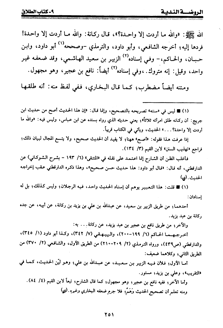 (¬1) • ليس في " سننه " تصريحه بالتصحيح، وإنما قال: " إن هذا الحديث أصح من حديث ابن جريج: أن ركانة طلق امرأته ثلاثا "؛ يعني حديثه الذي رواه بسنده عن ابن عباس، وليس فيه: " والله ما أردت إلا واحدة؟ ... " الحديث، ويأتي في الكتاب قريبا.