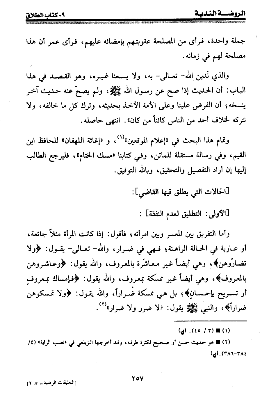 وأما التفريق بين المعسر وبين امرأته؛ فأقول: إذا كانت المرأة مثلا جائعة، أو عارية في الحالة الراهنة؛ فهي في ضرار، والله - تعالى - يقول: {ولا تضاروهن} ، وهي أيضا غير معاشرة بالمعروف، والله يقول: {وعاشروهن بالمعروف} ، وهي أيضا غير ممسكة بمعروف، والله يقول: {فإمساك بمعروف أو تسريح بإحسان} ؛ بل هي ممسكة ضرارا، والله يقول: {ولا تمسكوهن ضرارا} ، والنبي صلى الله عليه وسلم يقول: " لا ضرر ولا ضرار " (¬2) .