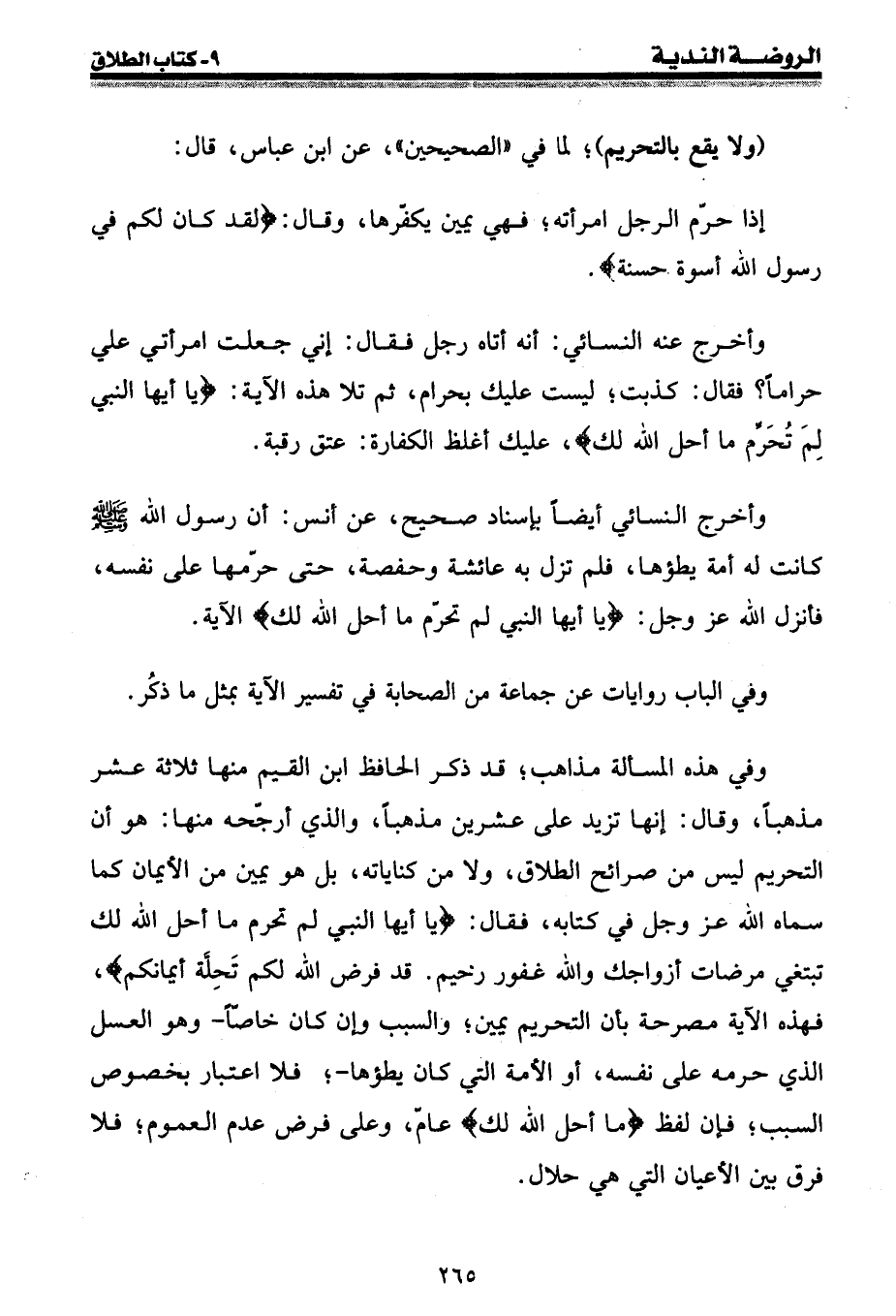 وفي هذه المسألة مذاهب؛ قد ذكر الحافظ ابن القيم منها ثلاثة عشر مذهبا، وقال: إنها تزيد على عشرين مذهبا، والذي أرجحه منها: هو أن التحريم ليس من صرائح الطلاق، ولا من كناياته، بل هو يمين من الأيمان كما سماه الله عز وجل في كتابه، فقال: {يا أيها النبي لم تحرم ما أحل الله لك تبتغي مرضات أزواجك والله غفور رحيم قد فرض الله لكم تحلة أيمانكم} ، فهذه الآية مصرحة بأن التحريم يمين؛ والسبب وإن كان خاصا - وهو العسل الذي حرمه على نفسه، أو الأمة التي كان يطؤها -؛ فلا اعتبار بخصوص السبب؛ فإن لفظ {ما أحل الله لك} عام، وعلى فرض عدم العموم؛ فلا فرق بين الأعيان التي هي حلال.