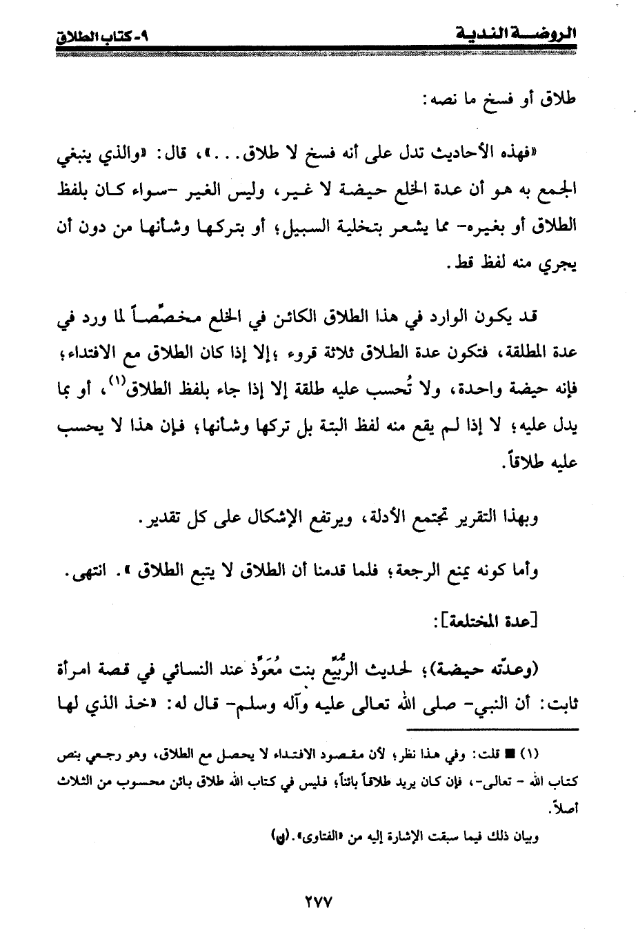 " فهذه الأحاديث تدل على أنه فسخ لا طلاق ... "، قال: " والذي ينبغي الجمع به هو أن عدة الخلع حيضة لا غير، وليس الغير - سواء كان بلفظ الطلاق أو بغيره - مما يشعر بتخلية السبيل؛ أو بتركها وشأنها من دون أن يجري منه لفظ قط.