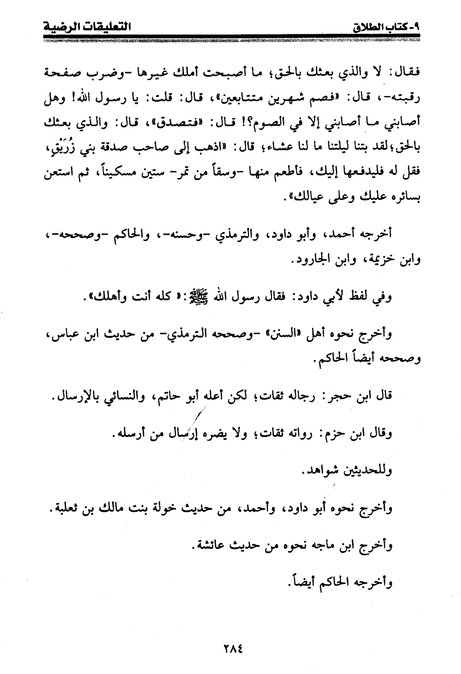 فقال: لا والذي بعثك بالحق؛ ما أصبحت أملك غيرها - وضرب صفحة رقبته -، قال: " فصم شهرين متتابعين "، قال: قلت: يا رسول الله {وهل أصابني ما أصابني إلا في الصوم؟} قال: " فتصدق "، قال: والذي بعثك بالحق؛ لقد بتنا ليلتنا ما لنا عشاء؛ قال: " اذهب إلى صاحب صدقة بني زريق، فقل له فليدفعها إليك، فأطعم منها - وسقا من تمر - ستين مسكينا، ثم استعن بسائره عليك وعلى عيالك ".