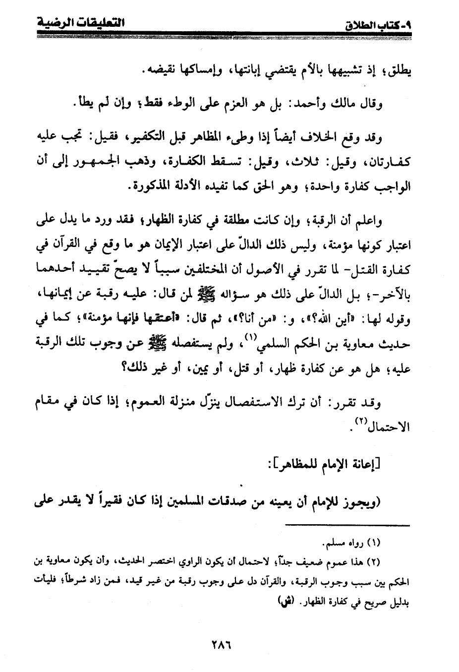 (¬2) هذا عموم ضعيف جدا؛ لاحتمال أن يكون الراوي اختصر الحديث، وأن يكون معاوية بن الحكم بين سبب وجوب الرقبة، والقرآن دل على وجوب رقبة من غير قيد، فمن زاد شرطا؛ فليأت بدليل صريح في كفارة الظهار. (ش)